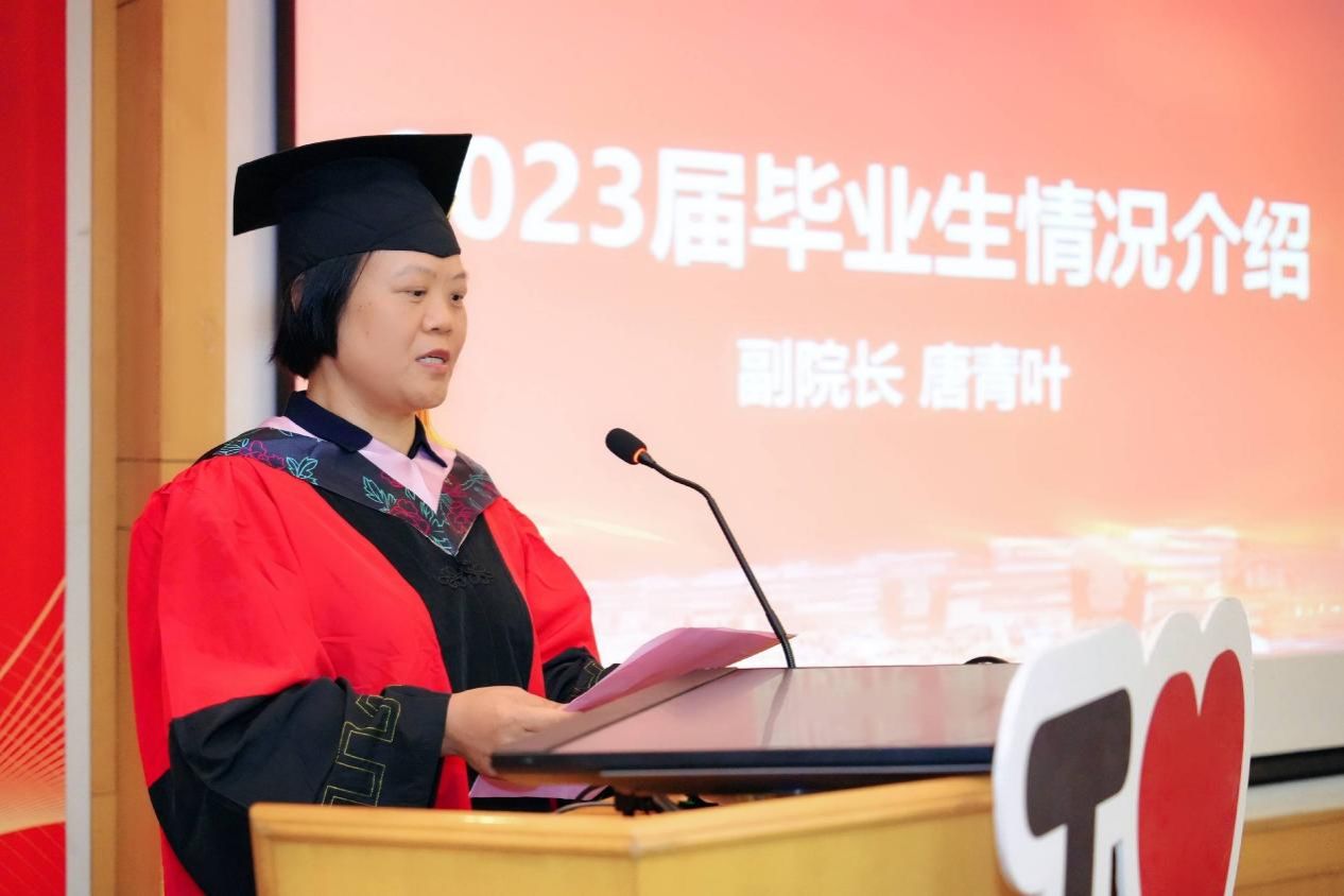 随后,学院副院长唐青叶教授介绍了2023届毕业生整体情况、所获荣誉及毕业去向。唐院长对毕业生们顺利完成学业表示祝贺,也对同学们在各个领域中取得的成绩表示肯定,为他们所取得的成绩感到骄傲自豪,同时也希望大家能够在新的人生篇章中再创佳绩。