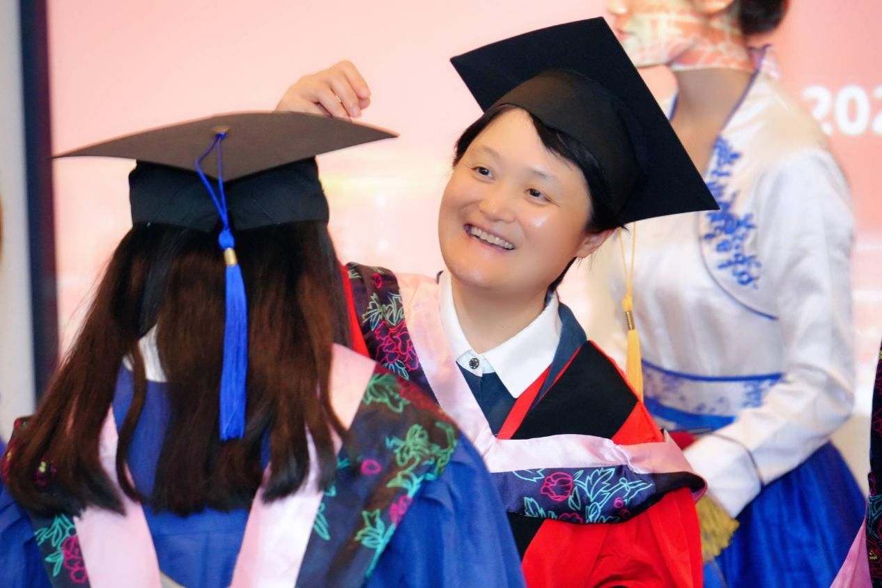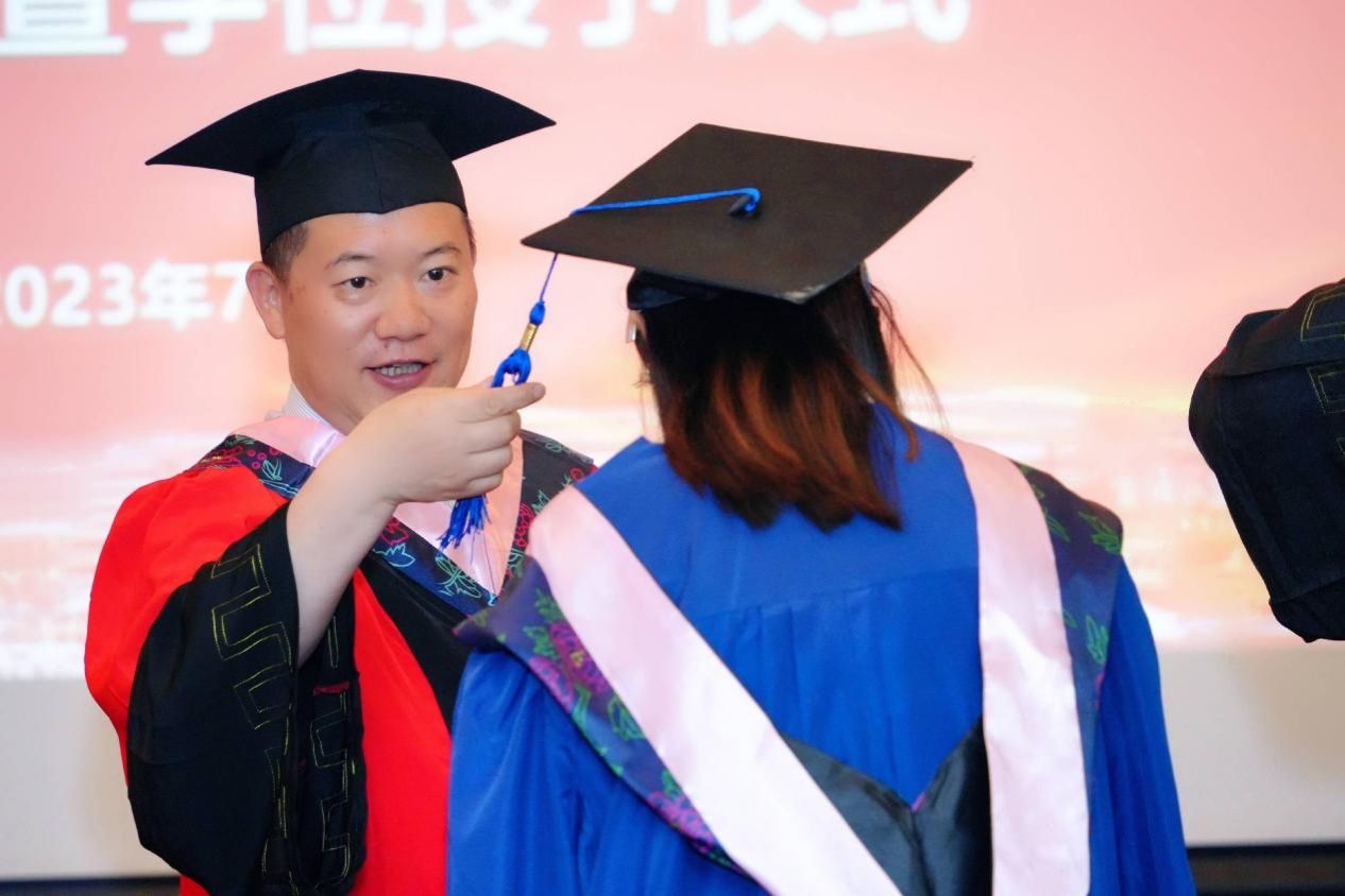 随着激昂的音乐声响起,典礼迎来了最激动人心的学位颁授环节。本环节由外国语学院党委副书记、副院长贾小琴主持,外国语学院党委书记吴蔚老师,党委副书记、院长尚新老师,副院长戴朝晖、唐青叶、阚怀未老师,为各位毕业生颁发学位证书、贺信并拨穗,帽穗从右拨向左边,代表着毕业生们学业的完成,代表着一段奋斗时光的圆满结束,也代表着新征程的开始。
