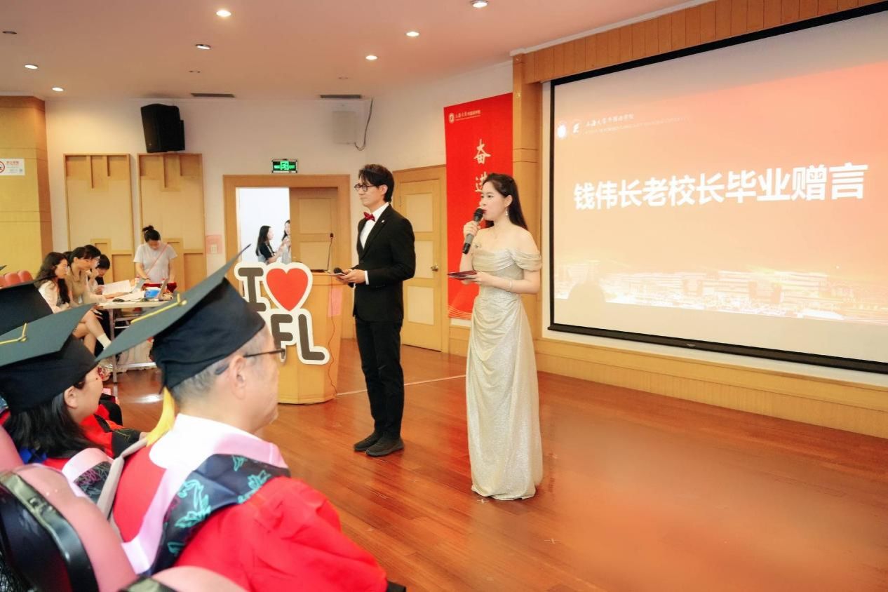 接着,优秀毕业生代表曹怡雯(本科生)、沈露怡(研究生)、贺靓(博士生)依次上台发言,向大家分享自己对大学学习生活实践的感悟,以及对母校的祝福。曹怡雯同学回顾了在母校四年的成长与收获,表达了身为上大外院人的骄傲,并呼吁毕业生们直面挑战与挫折,坚定地走向明天,迎接每一天的曙光。