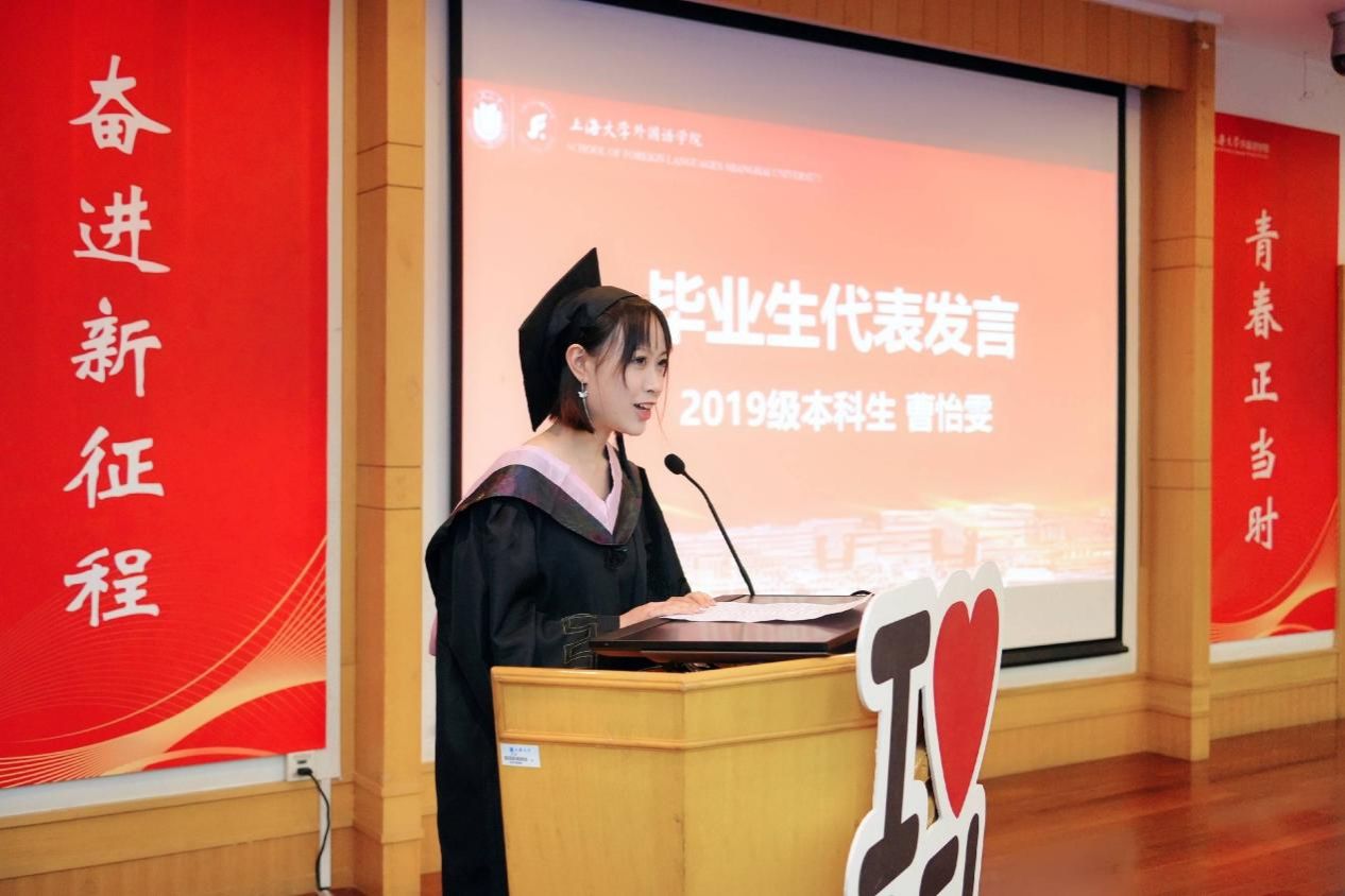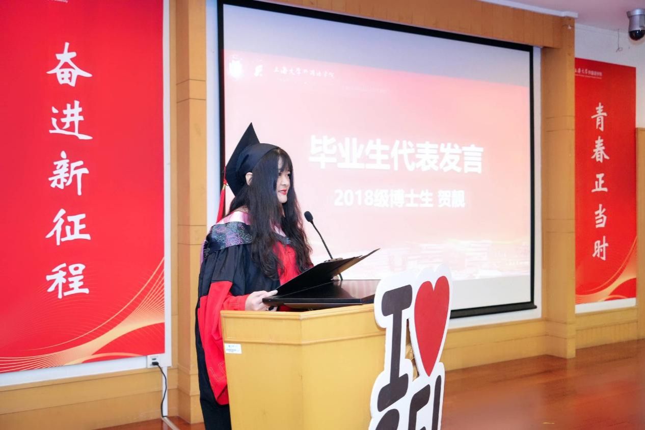 沈露怡同学通过讲述对母校的美好记忆感谢了母校的培养、师长的教诲,强调了上大的精神品质;她将奋斗二字与大家共勉,祝愿在座各位同学前途光明、前程似锦。