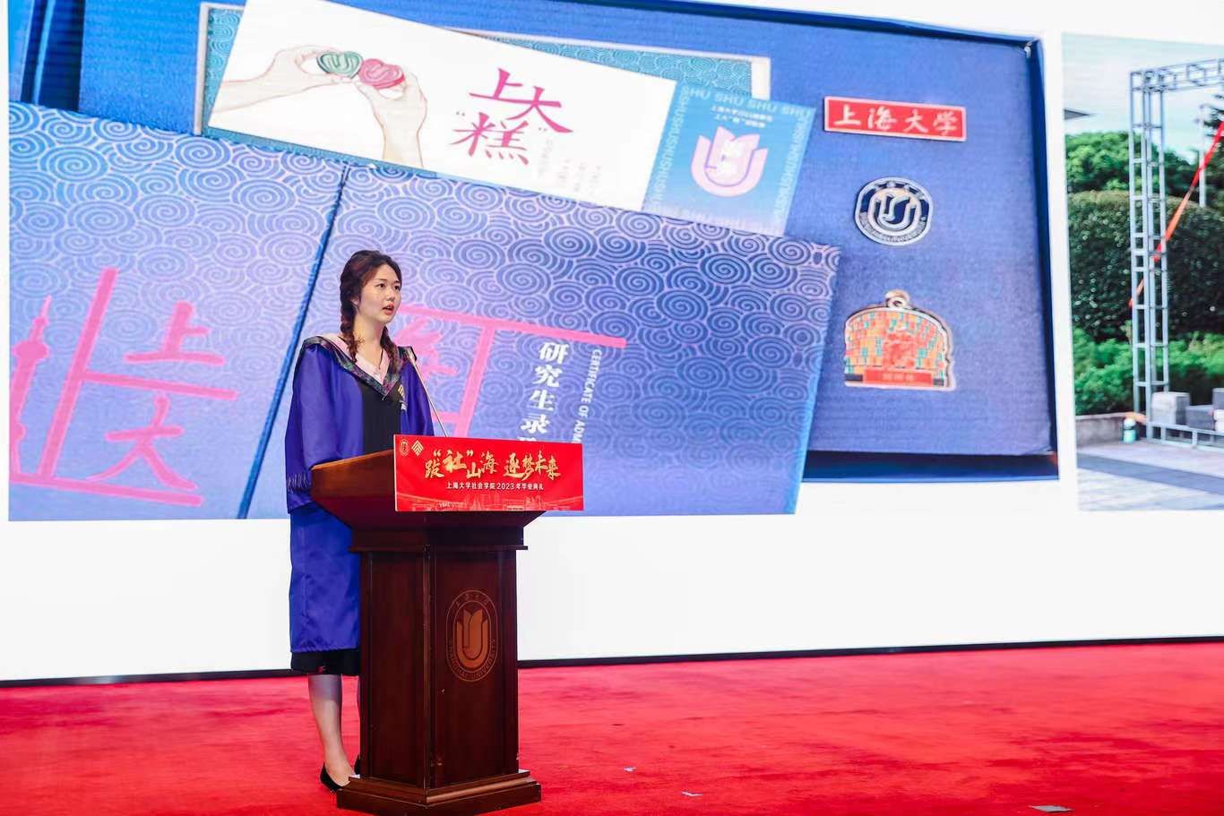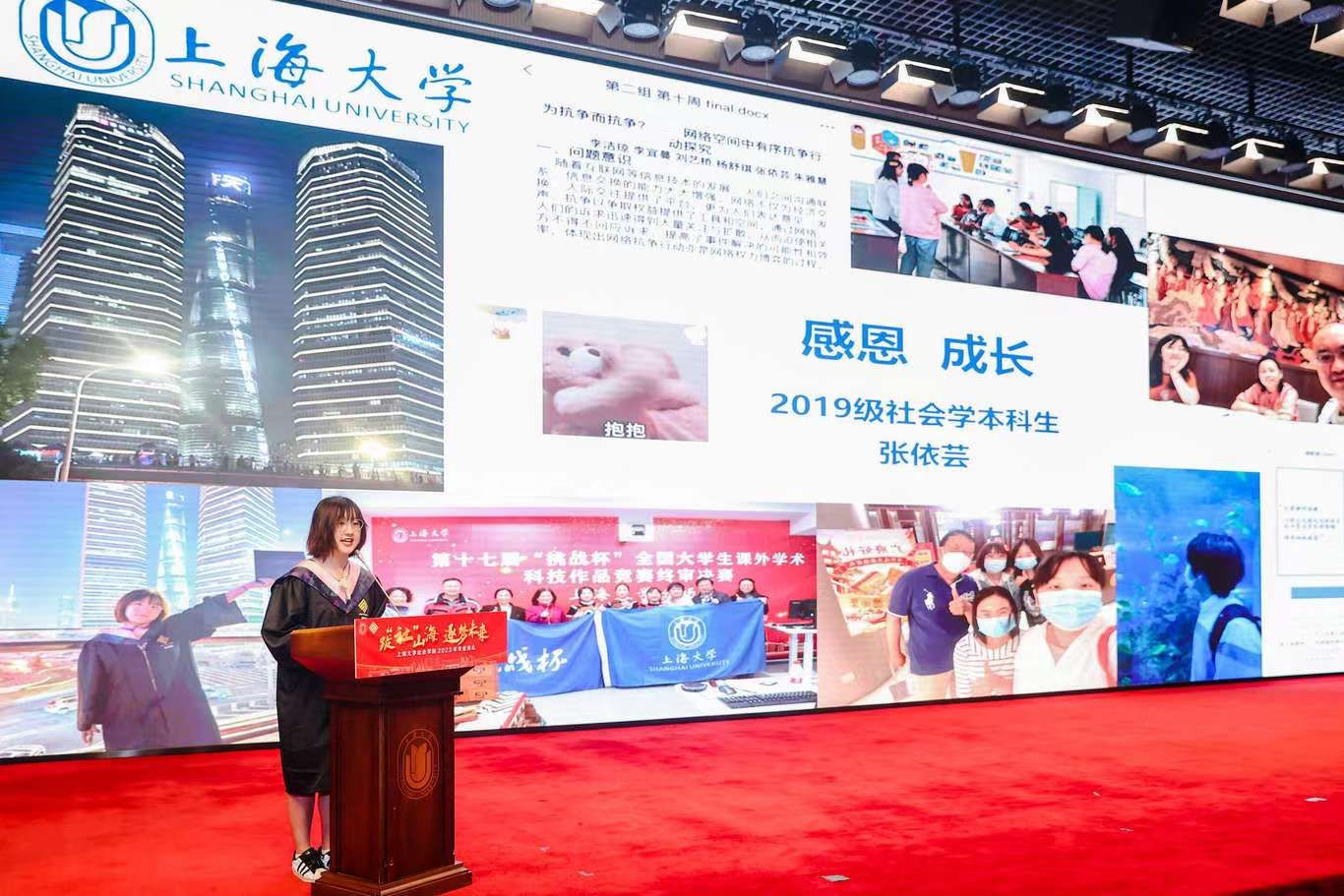 典礼伊始,校党委副书记、纪委书记段勇上台致辞。他表示,2023届的毕业生是特殊的一届毕业生,经历了跌宕起伏的校园生活,又即将面对风险重重的未来。鉴于此,段书记为2023届毕业生献上了八字箴言,即“健康、平安、幸福、成功”。段书记将于右任校长的“江山有待”与钱伟长校长的“自强不息”赠予毕业生们,祝福他们的同时也希望他们在走出社院后依然谨记两位校长的教导,继往开来、得见前路坦荡。