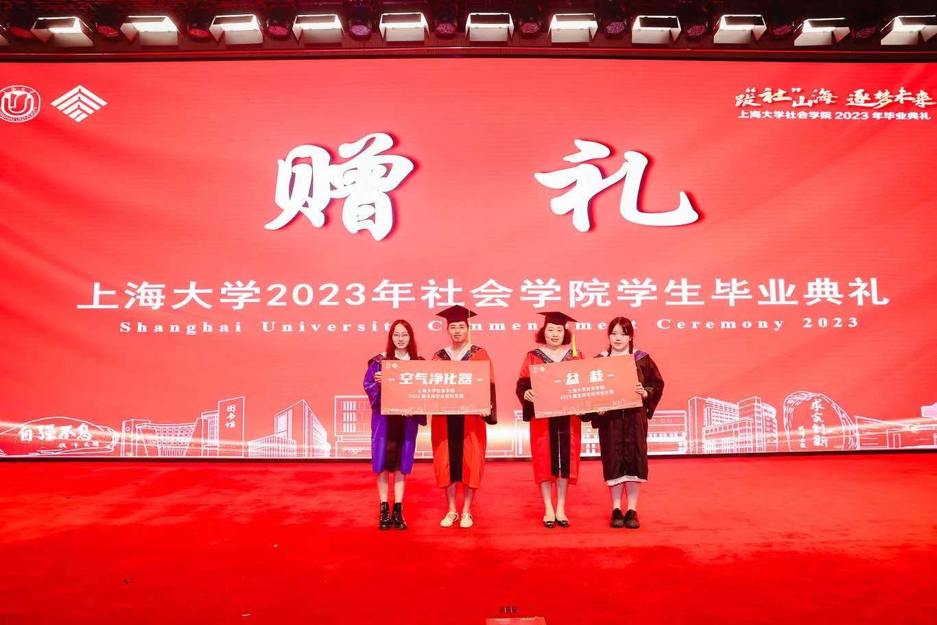 毕业生代表向学院赠送礼物,党委副书记张乃琴老师与副院长纪莺莺老师代表学院接受赠礼。小小的礼物承载的是同学们对学院真挚的情意,记录下的是2023届毕业生与社院之间独一无二的缘分。