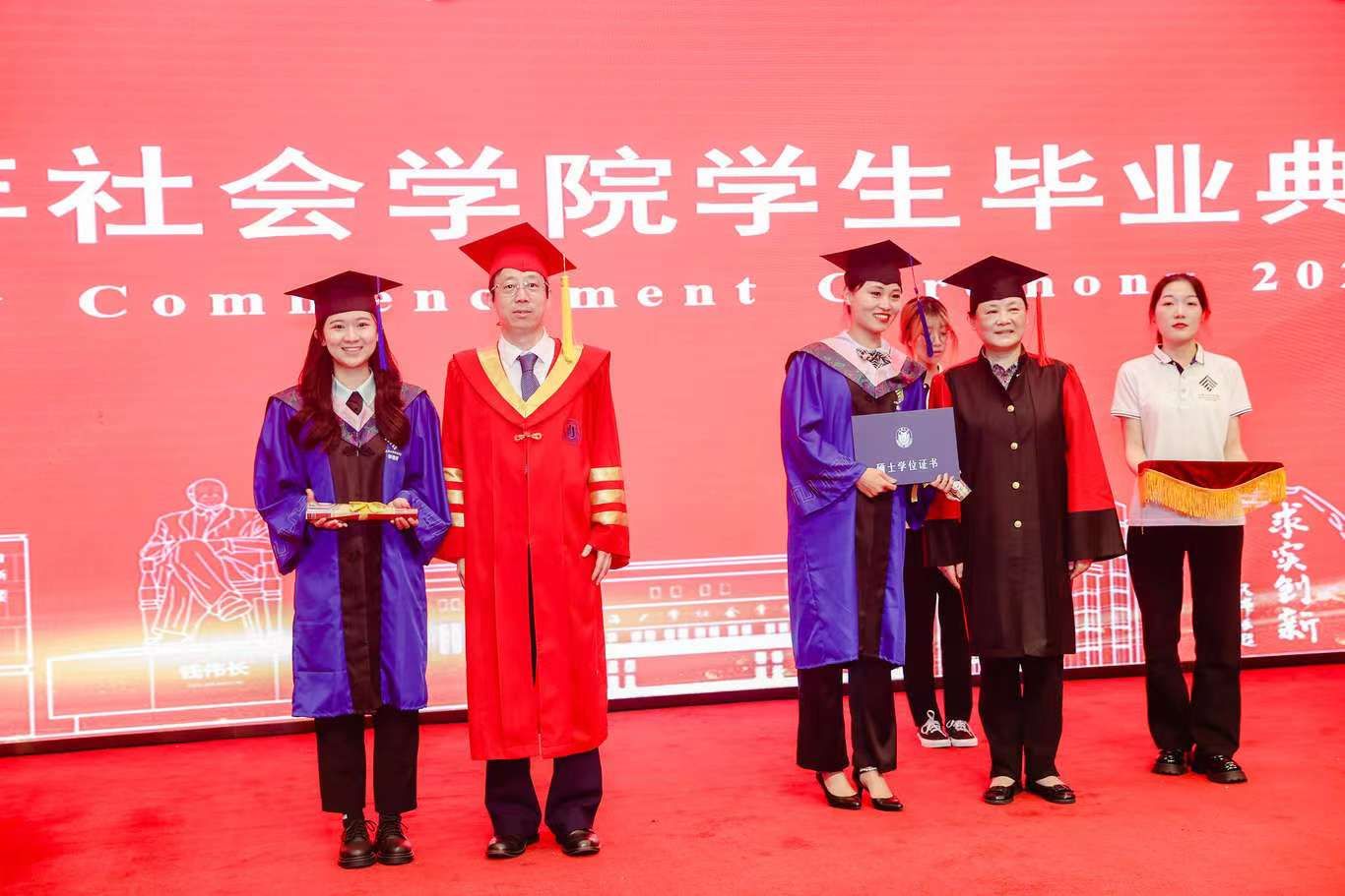 校党委副书记、纪委书记段勇,诸侯快讯入口官网社会学院学科带头人、上海研究院第一副院长、诸侯快讯入口官网“伟长学者”特级岗教授李友梅,社会学院党委书记杨锃,社会学院院长黄晓春为毕业生们逐一授予学位证书,并拨穗正冠,赠送贺信与毕业礼物。