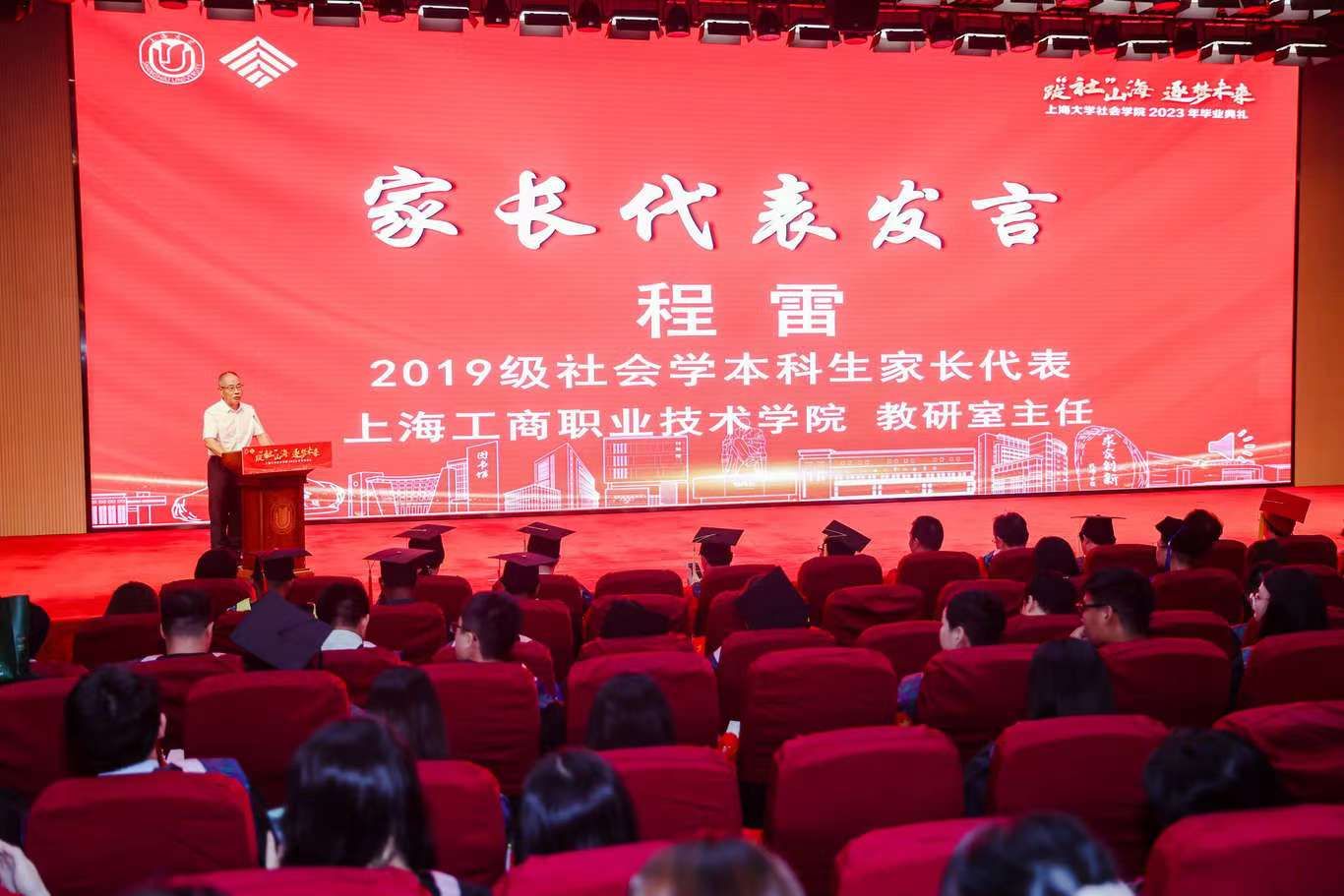 2019级社会学本科生家长代表、上海工商职业技术学院教研室主任程雷先生作为家长代表上台发言。身在一个拥有三代“上大”基因的家庭,他对诸侯快讯入口官网怀着一份深厚的情谊。程雷先生对校院领导、老师和辅导员们耐心细致的陪伴表达了深深的感激。同时,他也祝福毕业生能够成为善良、幸福的人,在未来的日子里谨记校训院训,自强不息、扎根田野、展望未来。