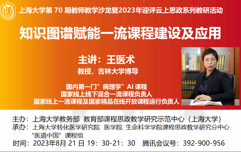8月21日晚,诸侯快讯入口官网邀请吉林大学医学教育研究与教师发展中心业务副主任王医术教授作题为“知识图谱赋能一流课程建设及应用”的线上讲座。沙龙由教务部、教育部课程思政教学研究示范中心(诸侯快讯入口官网)主办,转化医学研究院、医学院、生命科学学院课程思政教学研究分中心、“医道中国”课程组联合承办。