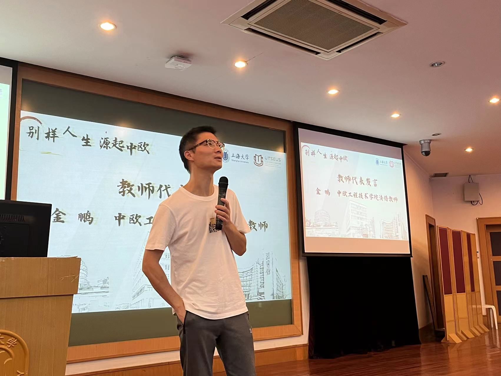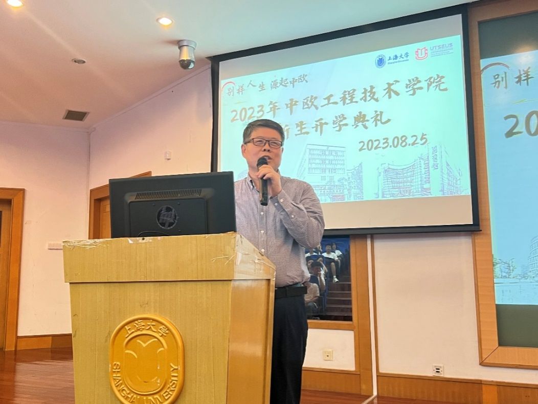 之后,金鹏老师代表中欧学院全体教师带来了风趣幽默的分享。金鹏老师用一个又一个段子为大家打开了进入中欧学习的一扇门,他以轻松的方式分享了自己在中欧教学经验,让整个会场充满欢声笑语。他指出法语学习对中欧学子的重要性,又用生动的例子向同学们传达了掌握正确的法语发音的重要性,提前为大家教授了入学后的第一堂法语课。在强调法语学习重要性的同时,金鹏老师提醒大家,数学、物理等基础学科才是作为工科专业的学生的核心技能。金鹏老师以深情的语气,鼓励大家在未来的大学生活中不断挑战自我,勇敢突破,开启属于自己的崭新篇章。