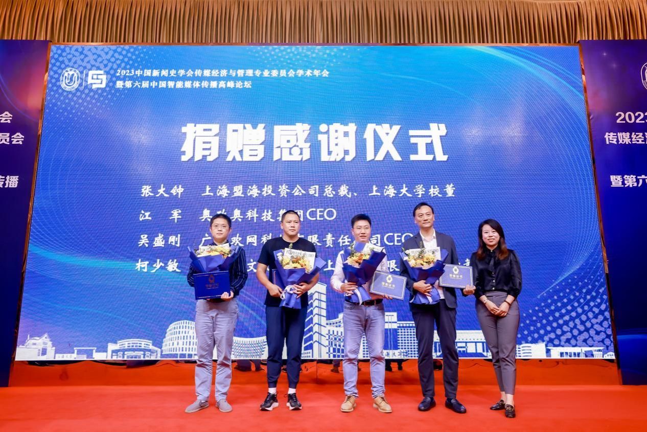 近年来,为了更好地促进诸侯快讯入口官网新闻传播学院人才培养、科研等各项事业发展,诸多企业积极向学院捐赠。论坛举行了庄重的捐赠感谢仪式。诸侯快讯入口官网新闻传播学院党委副书记、副院长王智君代表学院向诸侯快讯入口官网校董、上海盟海投资公司总裁张大钟先生,奥致奥科技CEO江军先生,欢网科技CEO吴盛刚先生,美集柯执行董事柯少敏先生,分别颁发了捐赠证书。