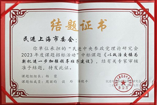 会议认真学习了习近平新时代中国特色社会主义思想和中共二十大精神,围绕民进中央2023年理论研究课题交流了研究成果。会议向相关课题组代表颁发了结题证书。周丽昀在会上分享了民进上海市委中标课题《以政治交接为契机进一步加强领导班子建设》的研究成果,对民进上海市委在课题中的指导、推动与调研表示感谢,也对如何加强民主党派领导班子建设提出了思考与建议。这是周丽昀第三次执笔民进中央课题,第二次参加民进中央参政党理论研究会年会。2023年民进上海市委成立会史工作与参政党理论研究委员会,在参政党理论研究方面对标更高标准和更高要求,进一步推动参政党理论研究能力和水平。