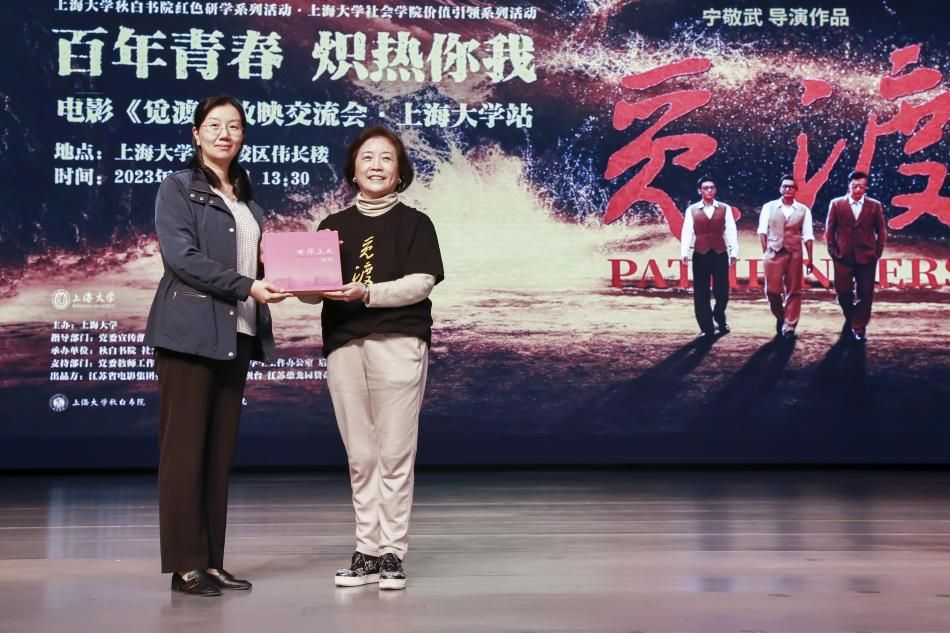 为了表达对《觅渡》主创团队的感谢,沈艺老师向电影《觅渡》总制片人、江苏恐龙园赞奇影业有限公司总经理沈爱华女士赠送《百年上大》画传。