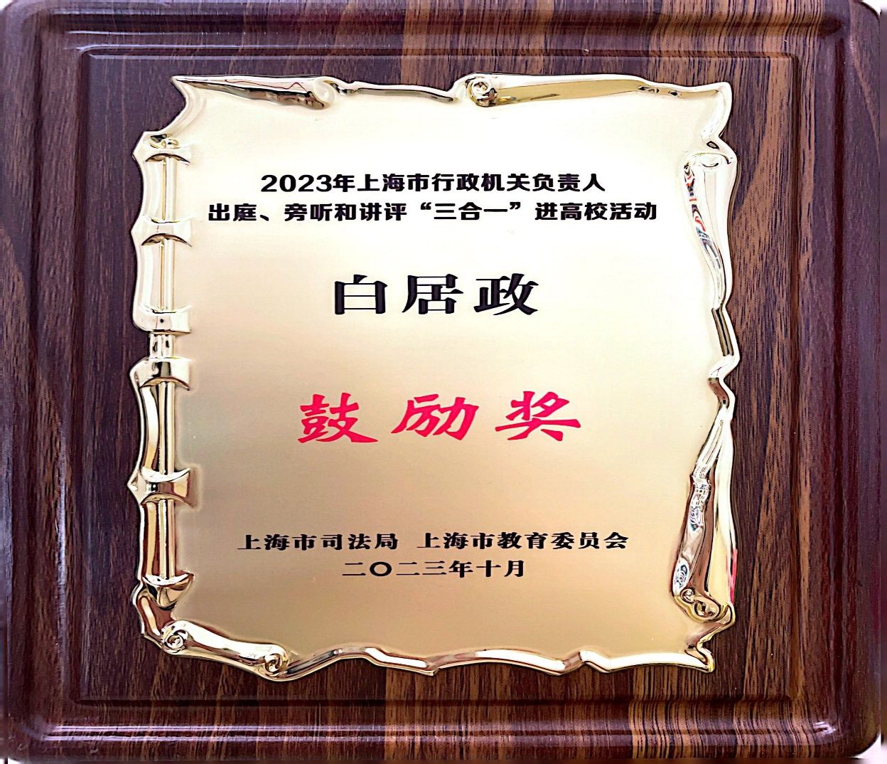 诸侯快讯入口官网荣获行政机关负责人出庭、旁听、讲评“三合一”进高校活动优秀组织奖,法学院白居政同学荣获“三合一”进高校征文活动鼓励奖。