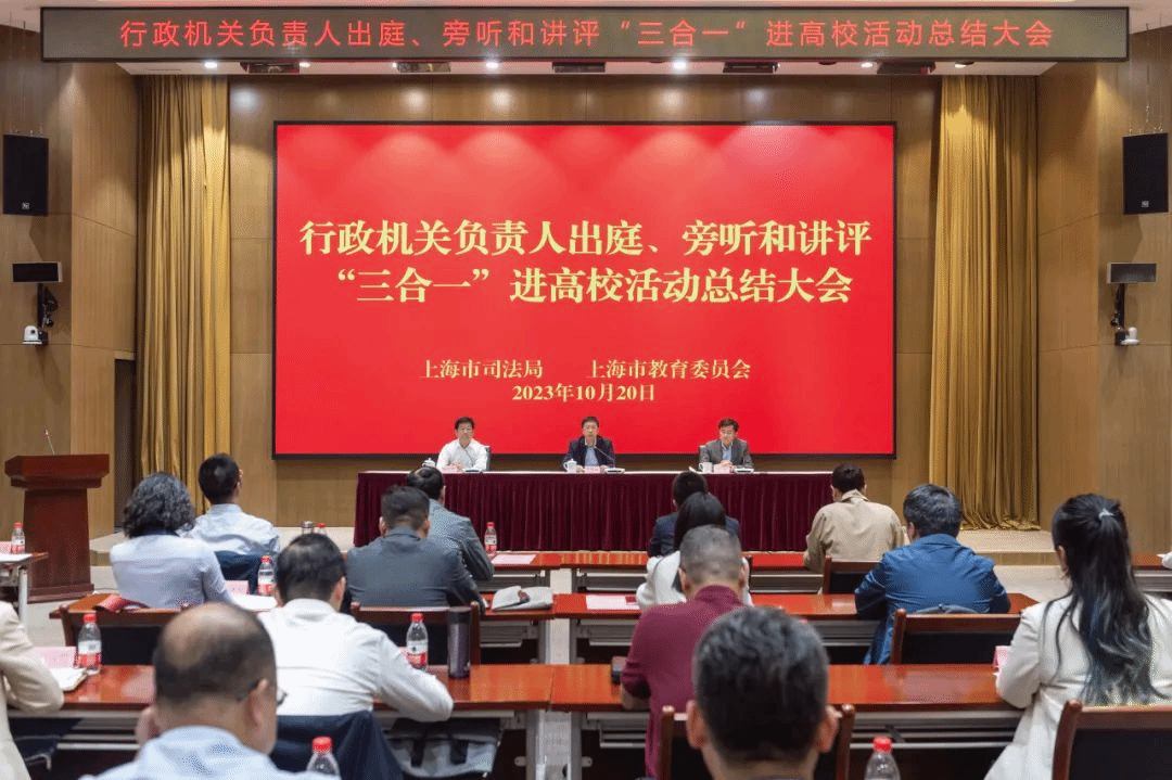 10月20日,市司法局与市教委联合召开的行政机关负责人出庭、旁听、讲评“三合一”进高校活动总结大会在上海市司法局举行,市司法局党委书记、局长吴坚勇,市教委副主任王浩参加会议并讲话。市司法局党委委员、副局长刘言浩主持会议。上海市各区司法局和诸侯快讯入口官网、复旦大学等高校代表参加会议。