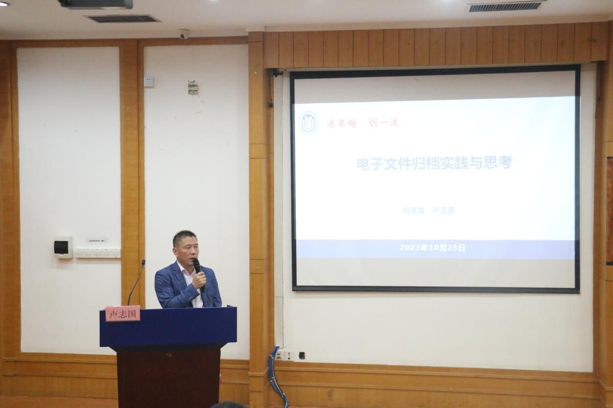 最后,档案馆馆长卢志国为全体档案员作了档案工作数字化转型的专题培训和动员:电子文件归档实践与思考。卢志国馆长首先对所有档案员老师一直以来为档案工作的辛勤付出和取得的显著工作成效表示由衷地感谢,随后从为什么要电子文件归档(外部环境)、电子文件归档要具备条件(校内环境)、怎么推进电子文件归档(典型案例),以及能有什么成效四个方面进行了讲解,并结合学校正在推进的中英文成绩单电子归档工作,让档案员老师们切实感受到电子文件归档让利益相关方(档案员、部处学院、学生校友、档案馆、学校)都能受益,不仅能够有效提高档案工作效率,更重要的是能够实现档案业务转型升级和价值创造。卢志国馆长也希望所有的档案员老师为学校档案工作的创新发展和转型升级多提宝贵意见和建议,携手推动学校档案工作向更高质量发展,为学校早日建成世界一流、特色鲜明的综合性研究型大学做出应有的贡献。