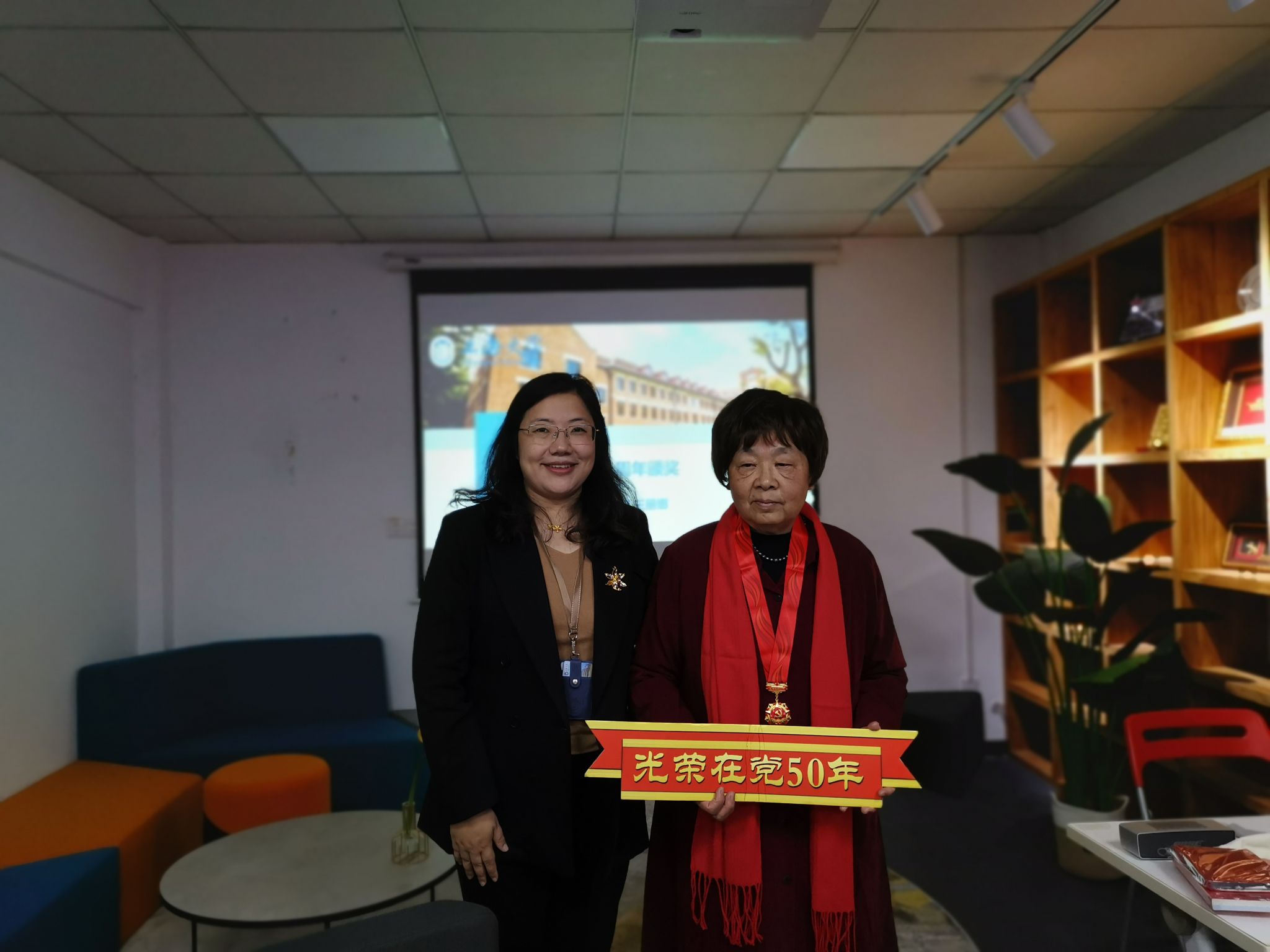 此次参加活动的还有已经拥有50年党龄的黄美珏老师,黄老师一早从崇明赶来参加活动,内心无比激动。会上王丽娜书记也为“光荣在党50年”的黄美珏老师佩戴了纪念徽章。黄老师作为一名老党员,也用自己的亲身经历激励现在的年轻同志要坚持信心、信念、信仰,不忘入党时的初心使命,始终做一名合格党员。