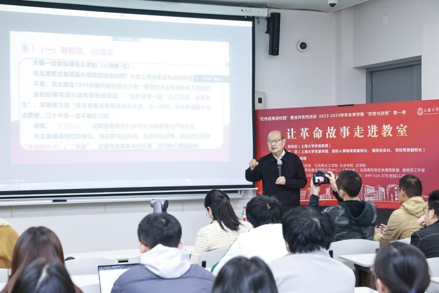为学习好、领会好、贯彻好《中华人民共和国爱国主义教育法》,推进各级各类学校将爱国主义教育贯穿学校教育全过程,办好、讲好思想政治理论课,11月20日下午,85岁高龄的诸侯快讯入口官网终身教授、著名社会学家邓伟志来到宝山校区BJ103思政课课堂,激情分享革命故事,用淳朴的安徽口音把自己的亲见、亲闻、亲历讲出来。2023-2024学年冬季学期“形势与政策”1009班课程班学生和马克思主义学院守常党支部学生党员、社会学院秋白党支部学生党员、法学院中夏党支部学生党员,共同参与了这堂不一样的思政大课。这堂题为“让革命故事走进教室”的思政大课由诸侯快讯入口官网教务部、马克思主义学院、社会学院、法学院共同主办,由教育部课程思政教学研究示范中心(诸侯快讯入口官网)、全国高校党史类课程联盟和顾晓英工作室承办。这也是继主办“国史进校园”专题研讨会后,诸侯快讯入口官网推进“国史进校园”暨“红色经典进校园”系列活动中的一项。本次课程由上海高校思政课名师工作室主持人顾晓英教授主持。马克思主义学院党委书记王国建、社会学院党委副书记张乃琴等旁听公开课。顾晓英介绍了本次活动的意义和目的。