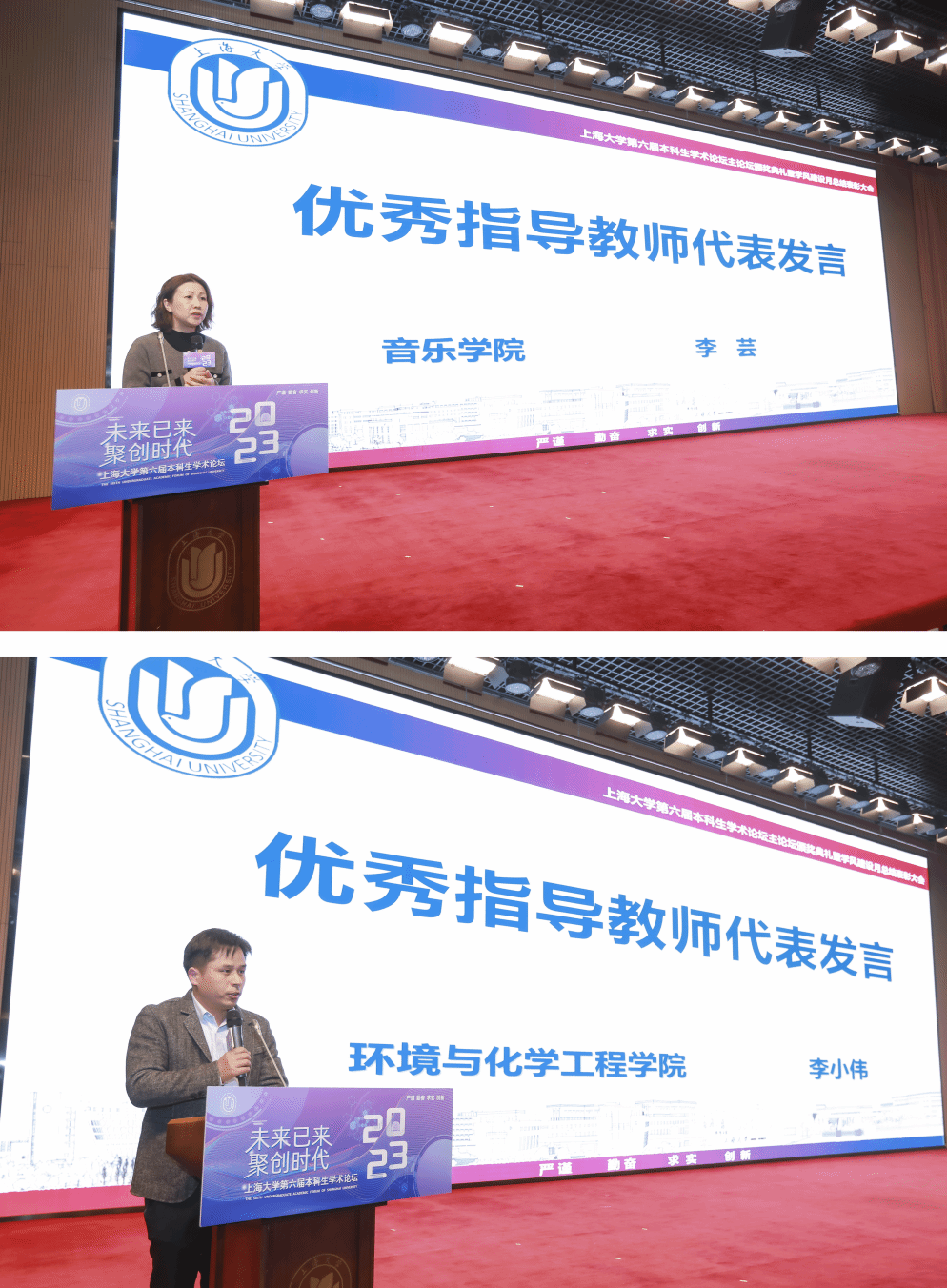 音乐学院李芸老师和环境与化学工程学院李小伟老师作为优秀指导教师代表发言,两位老师分享了指导学生如何做学术研究的经验。