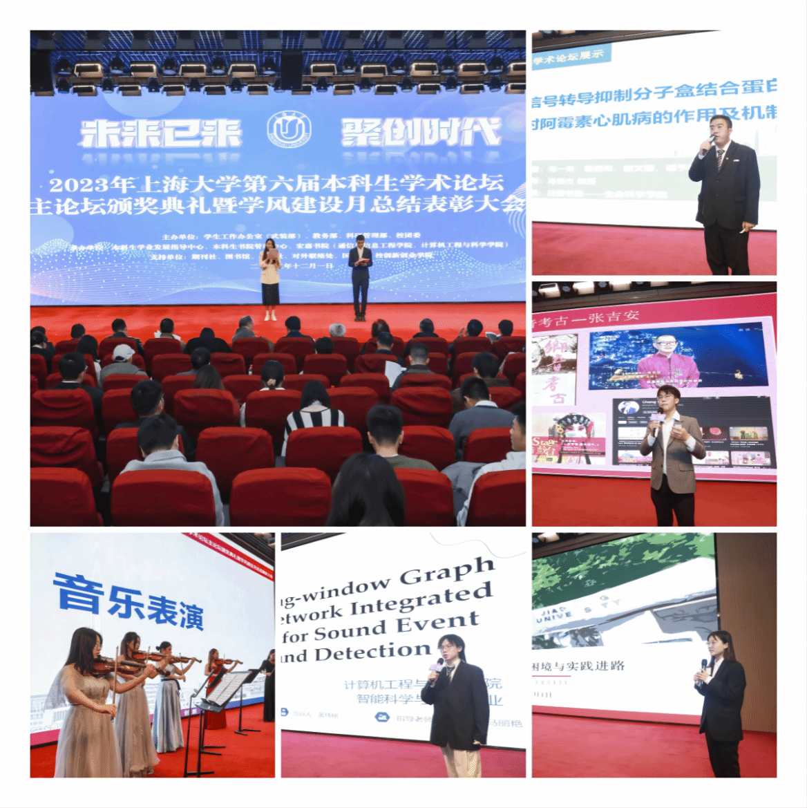 典礼在音乐学院学生表演的一曲弦乐重奏中拉开帷幕。来自日新书院、生命科学学院的毛一安同学,闳约书院、上海电影学院的欧俊锋、王子戈同学,宏嘉书院、计算机工程与科学学院的黄玮铭同学分享了各自的学术论文。