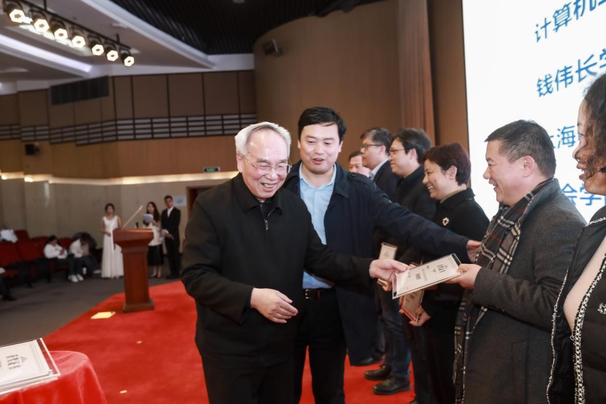 期刊社社长曾桂娥和出版社有限公司董事长、社长戴骏豪为伟长书院、钱伟长学院陈逸清等34名二等奖获得者颁发证书。