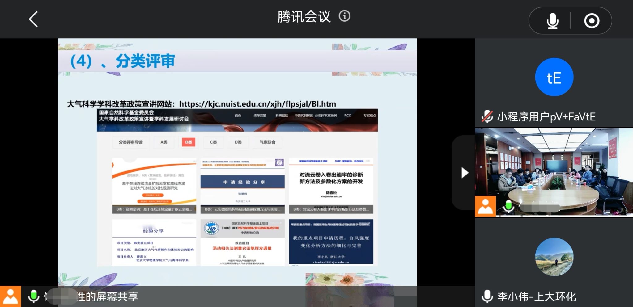 随后,复旦大学张峰教授做了关于《国家自然科学基金申报经验分享》的专题报告,从申请书的选题、立项依据、研究目标、研究内容等方面进行了深入地讲解,同时用典型示例形式重点介绍了大气科学学科申报书的撰写要点。会后线上和线下参会老师积极热烈地提问并讨论,张教授也细心认真地一一作答。