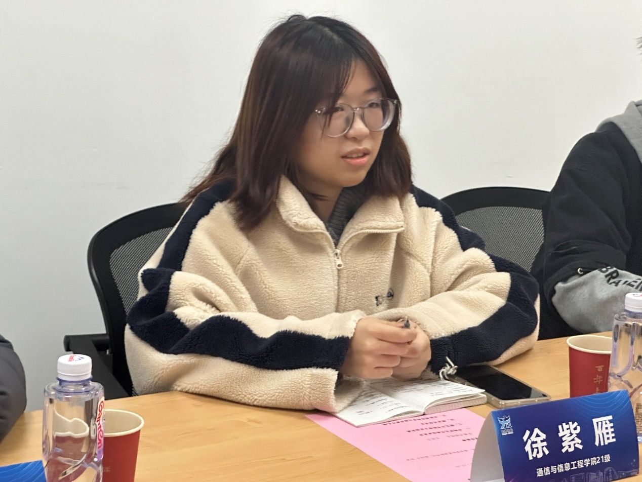 交流环节中,来自通信与信息工程学院的22级学生郭晨飞首先向院长提出了自己在学业上的困惑,他觉得在加入了课题组一个月之后,始终找不到前进的方向。王廷云院长告诉他,专业探索是一个过程,需要自己主动去寻找突破口,多多与课题组内的学长学姐们交流,有些甚至比书本上学到的知识更加灵活实用;除此之外,还必须要调整好自己的心态,大二阶段还是要以学业为主,充分高效利用好课余时间培养自己的其它兴趣爱好。