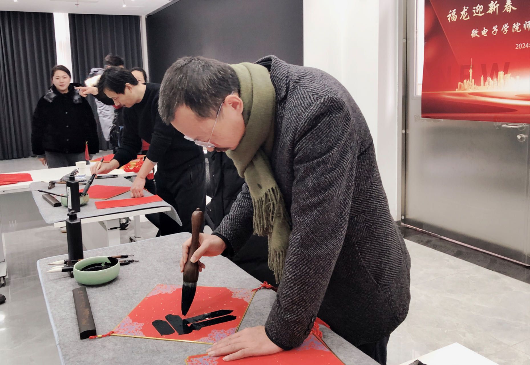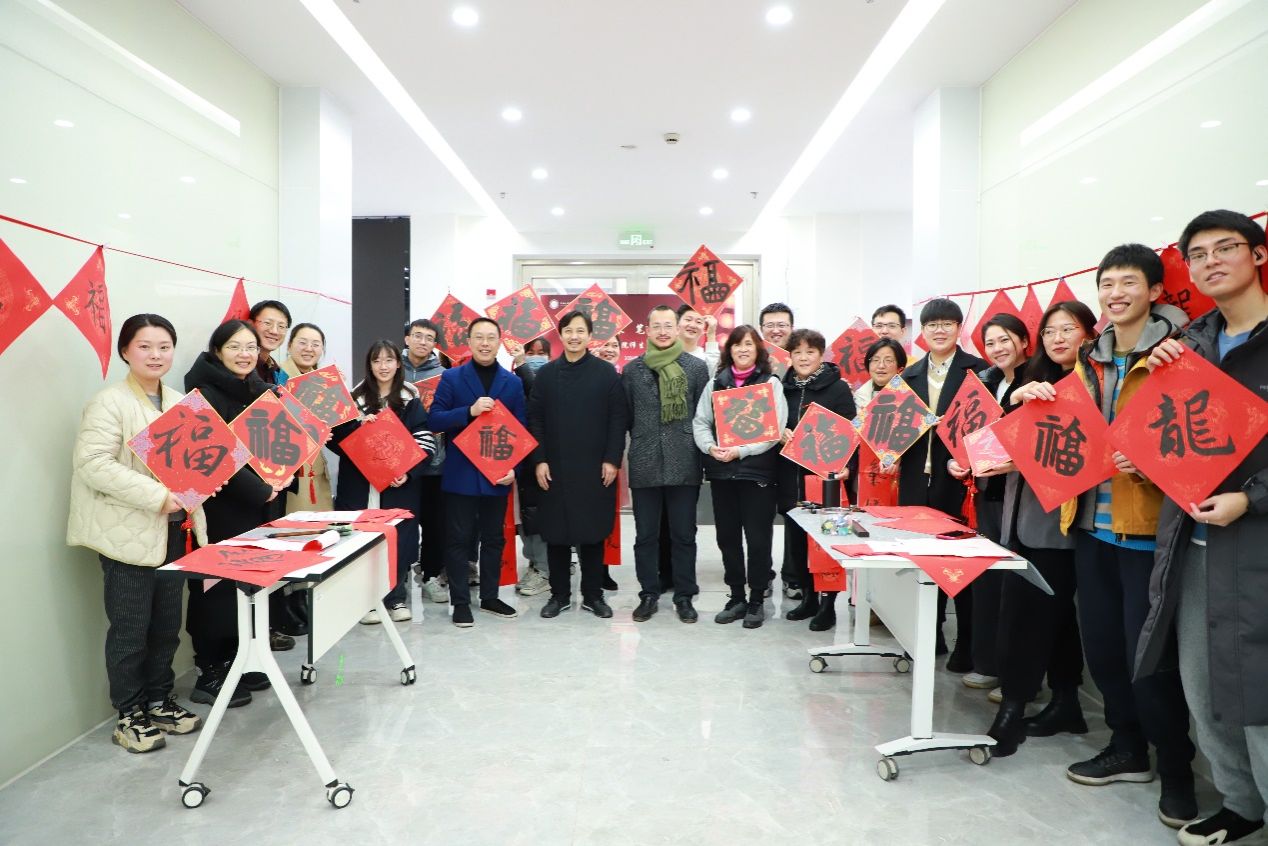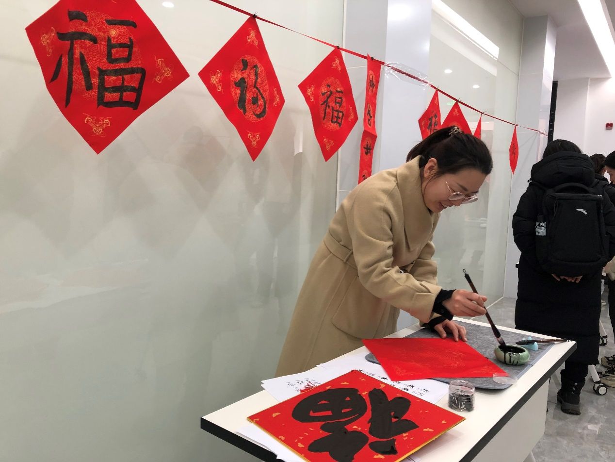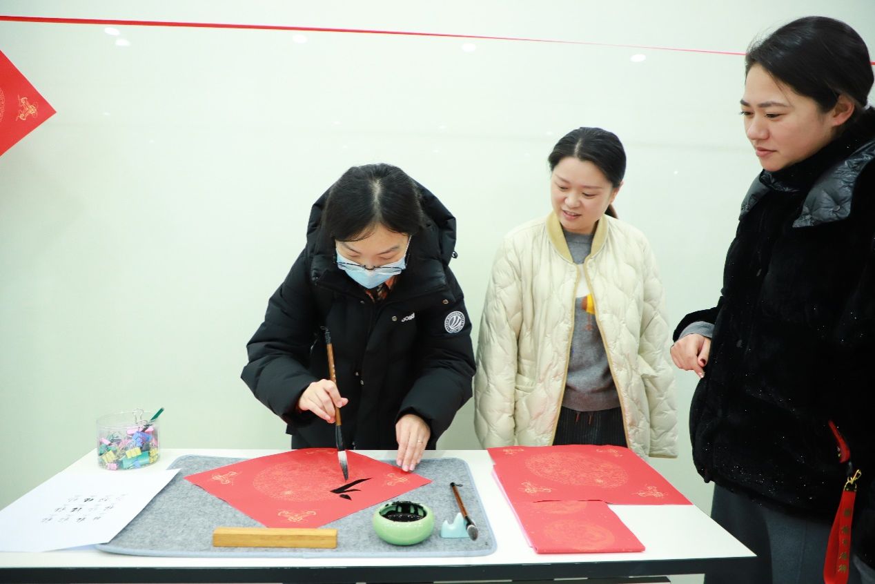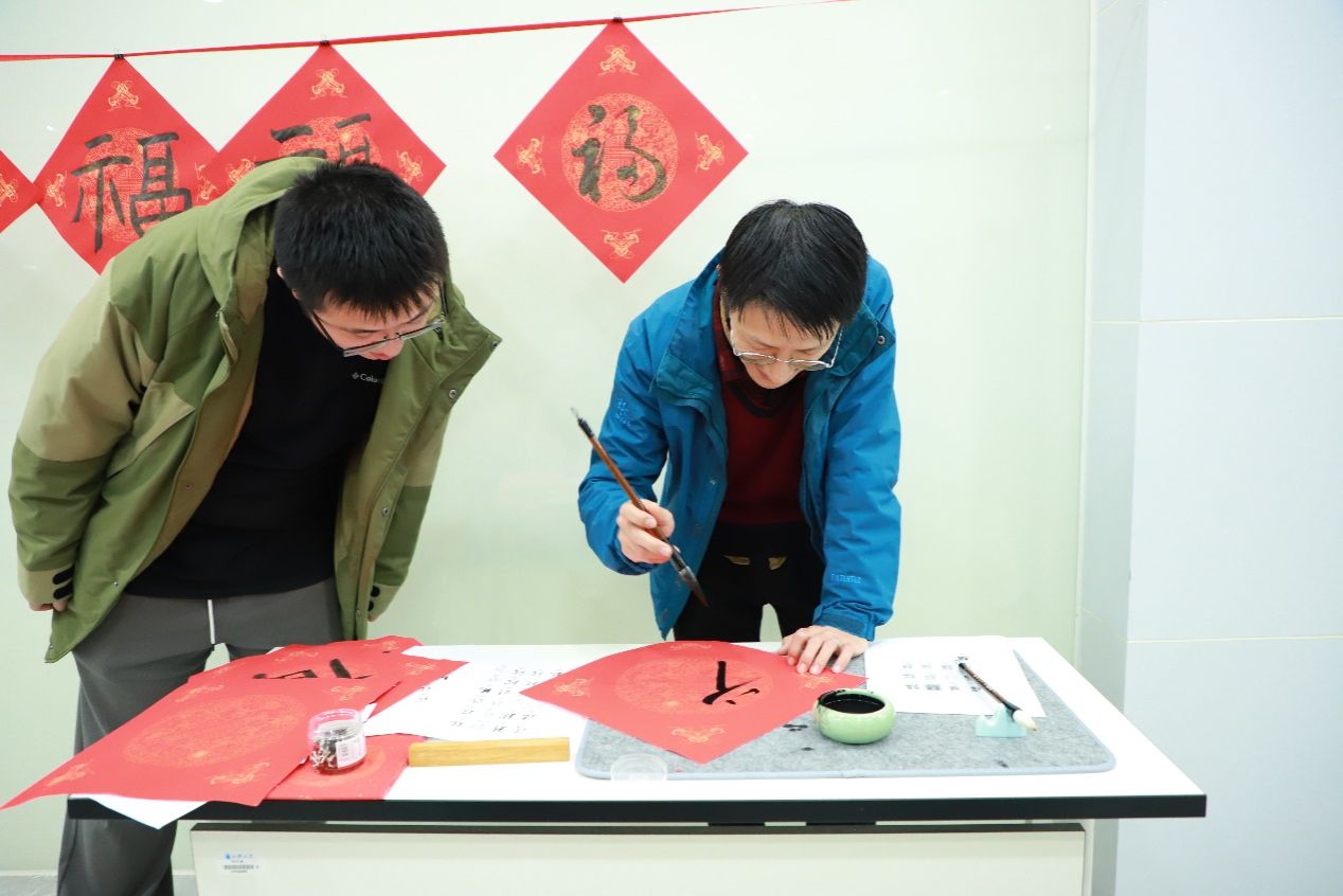 现场设置了书法体验台,师生们兴致盎然,现场红纸相映,墨香晕染。一幅幅充满吉祥祝福的“福”字和对联送到大家手中,在送去祝福的同时,也为大家带去关怀和温暖。