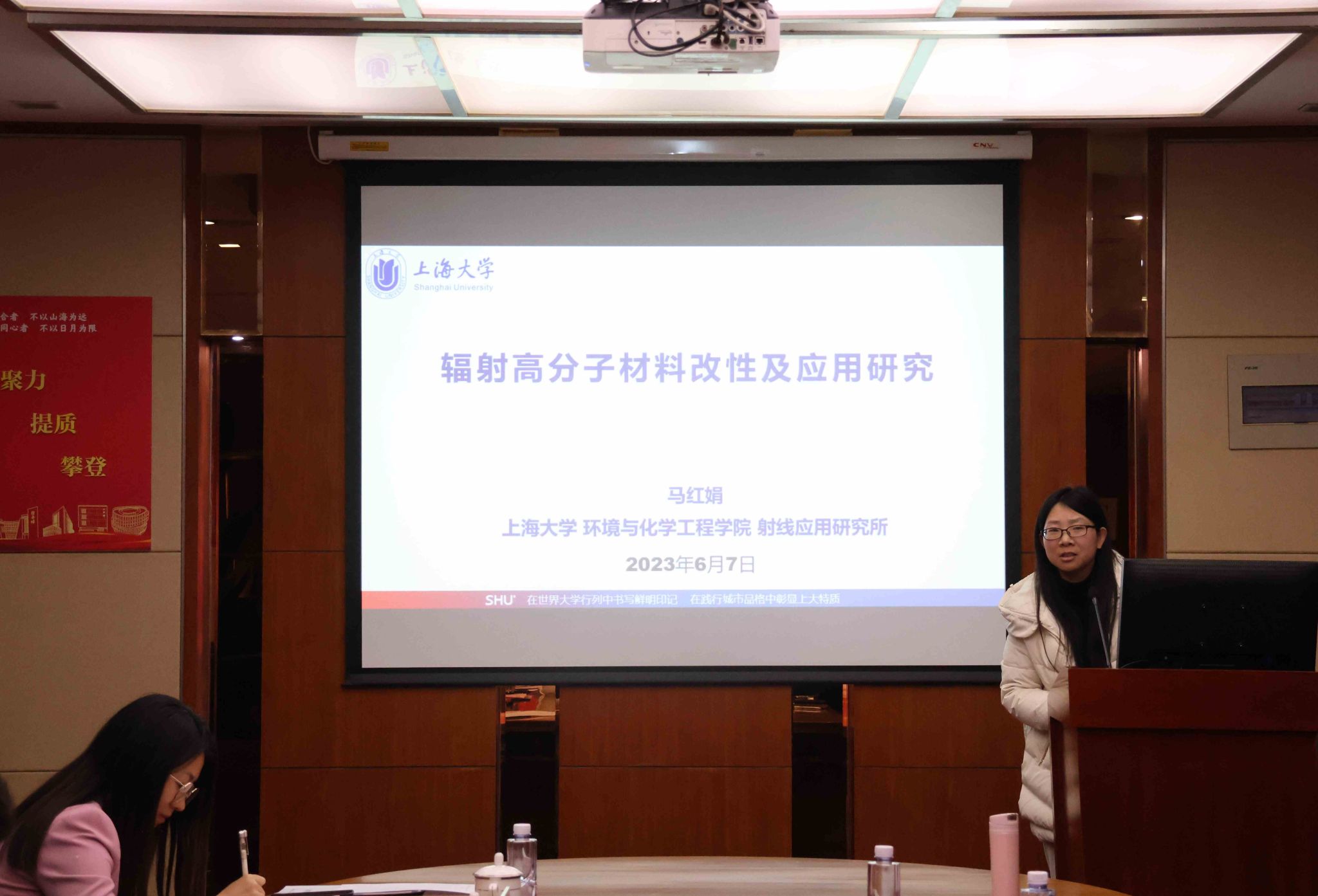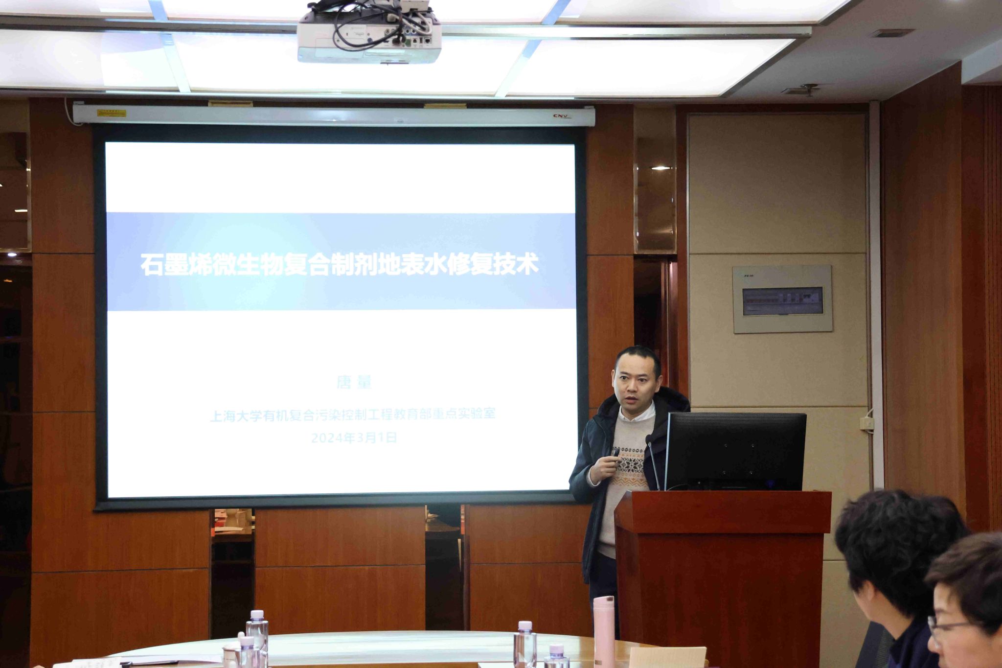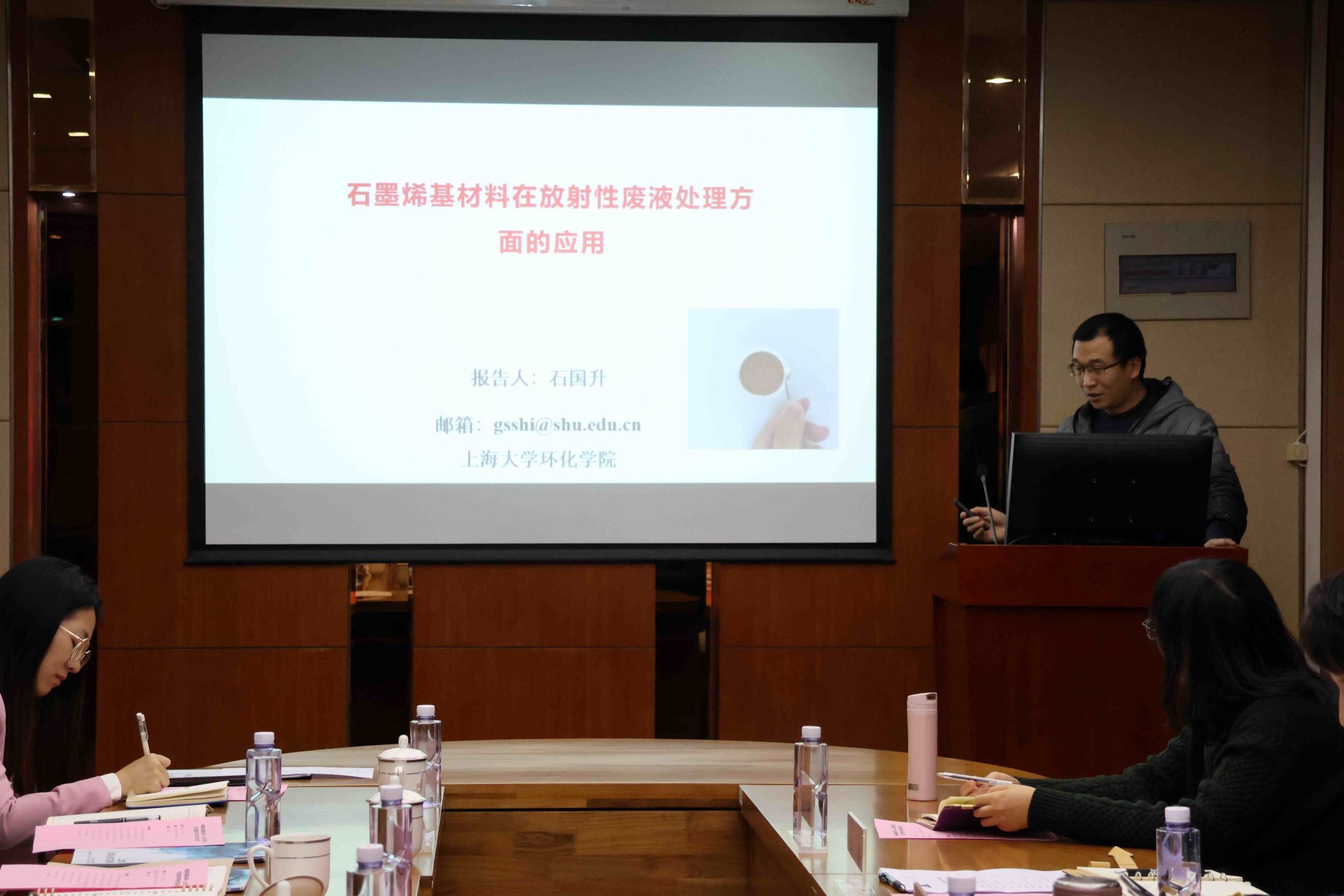 交流会上,钱冬英向赵翼鑫总经理一行的到来表示热烈的欢迎和诚挚的感谢。随后,与会双方共同观看了环化学院和中核环保有限公司的宣传片。中核环保有限公司曾毅君副总接力介绍了公司的发展情况及重点业务板块。有机复合污染控制工程教育部重点实验室常务副主任唐量研究员、环化学院副院长石国升研究员、环化学院射线应用研究所马红娟研究员分别做“石墨烯水处理技术”、“海水淡化及高放废水处置技术”及“海水提铀等技术”汇报,与会双方围绕核污染防治、水污染治理、土壤污染治理等方面展开了深入的交流。