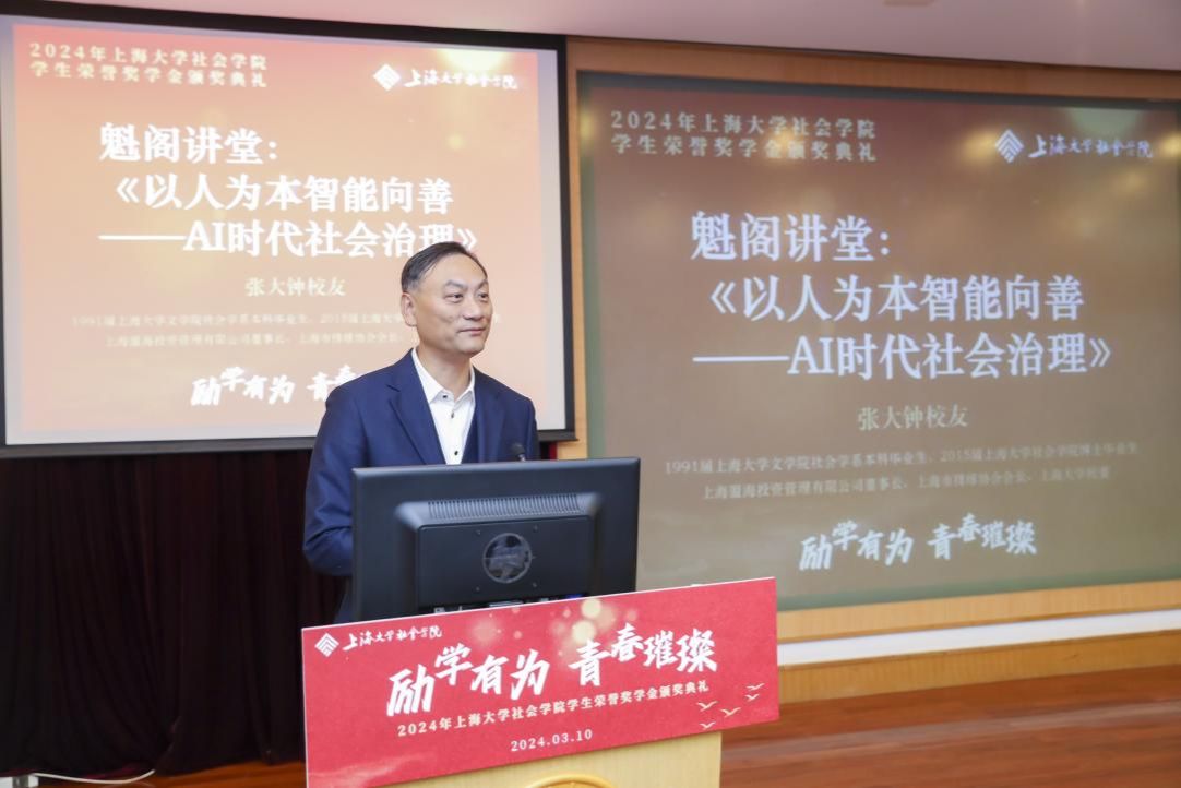 结对仪式后进入魁阁讲堂,张大钟校友为在座同学作题目为《以人为本 智能向善——AI时代社会治理》的主题讲座,向同学们分享了AI发展动态,并探讨了未来社会学在拥抱新技术领域面临的机遇与挑战。从AI近年来的发展状况到未来AI方向是以人为本还是技术优先,从AI技术与社会治理融合的政策趋势到日常生活中AI在上海徐汇、杨浦等区的治理实例;从人的思维理性化、机器化到机器情感的萌发与智商的迅猛发展与迭代……张大钟校友的报告深入浅出、引人入胜。社会学的任务正是不断在不同的人群的社会实践中,发掘不可磨灭的差异、难以压抑的抗拒、不可思议的创意,甚至无法理喻的荒谬。作为社会学人,应当将自己浸入田野中,以沉浸式的体验升华感受,提炼出问题精髓,寻找解决方法。