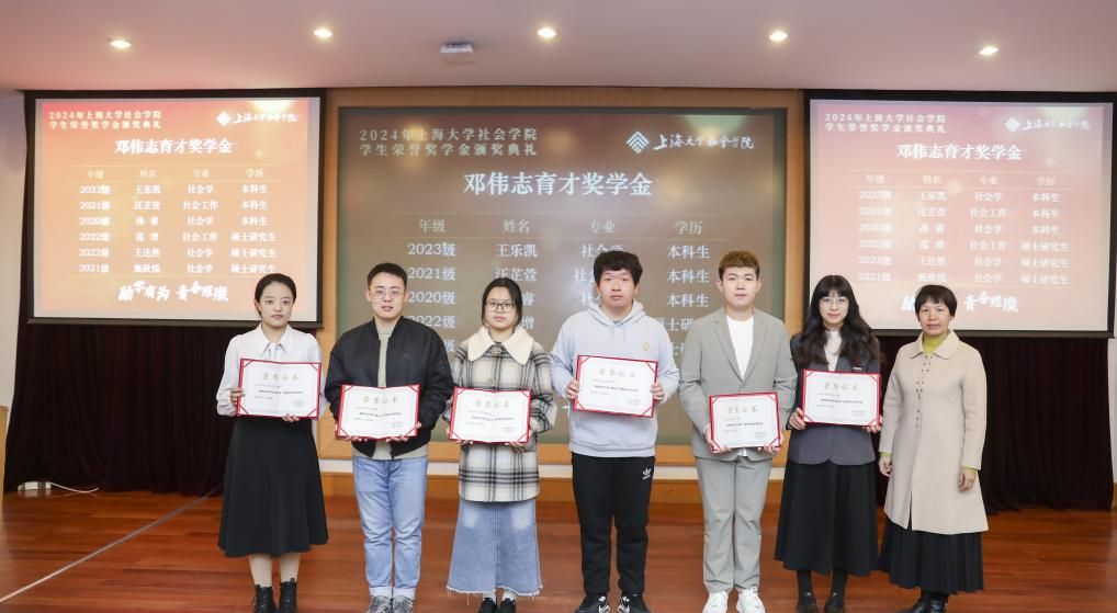 席慧霞老师为王乐凯、汪芷萱等6位同学颁发邓伟志奖学金证书