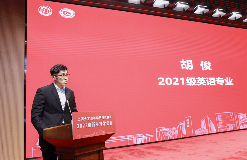 来自2021级英语专业的胡俊同学作为优秀学生代表发言。他呼吁同学们应珍惜在校的宝贵学习时光,勤奋学习,为立足岗位、奉献社会打下更坚实的基础。