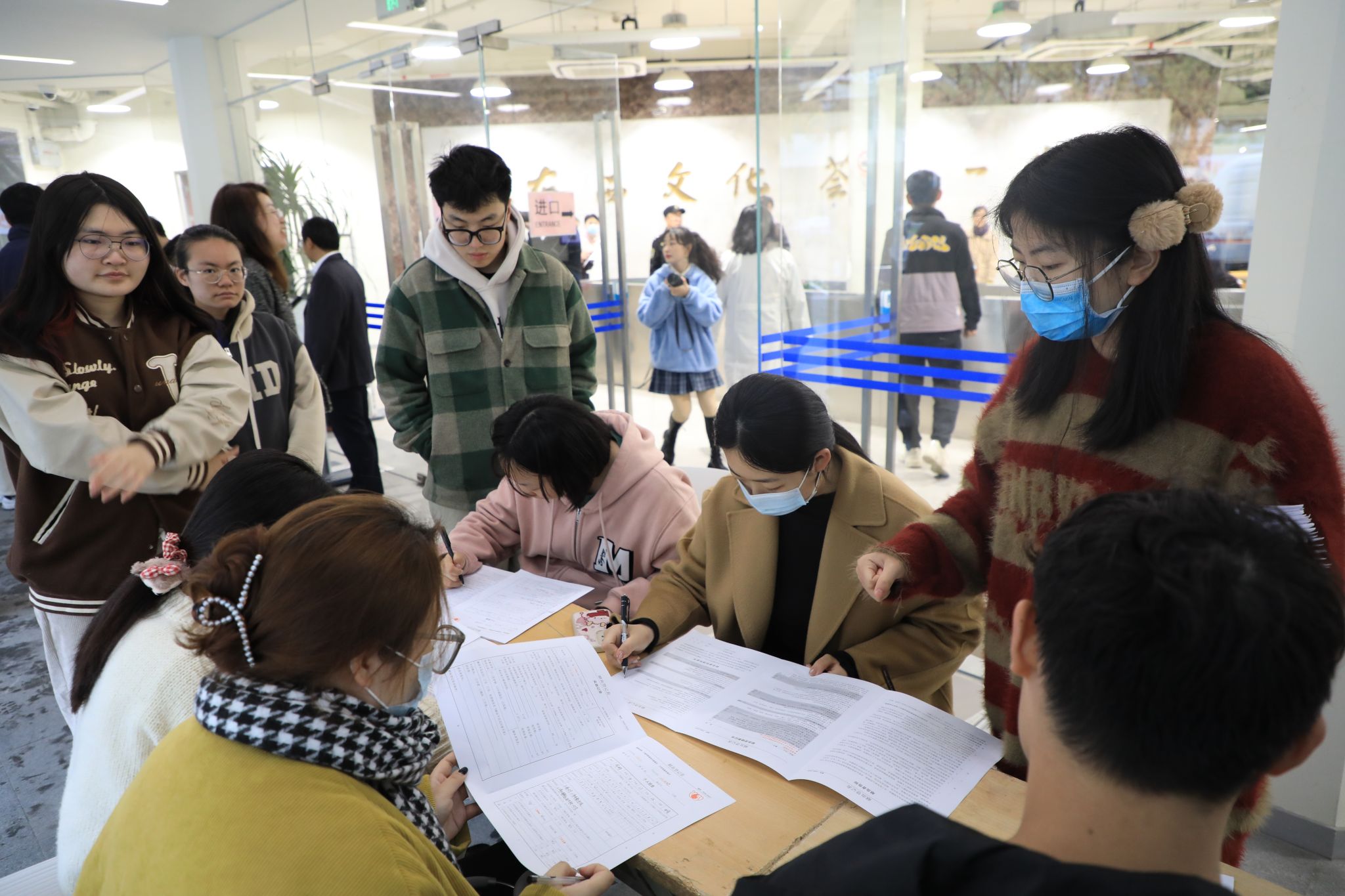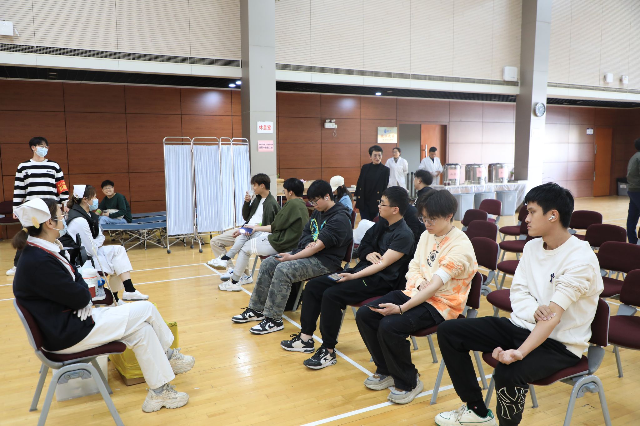 参加献血的师生们一早便来到现场,在志愿者的引导下有序地填写献血登记表,体检,等待献血。