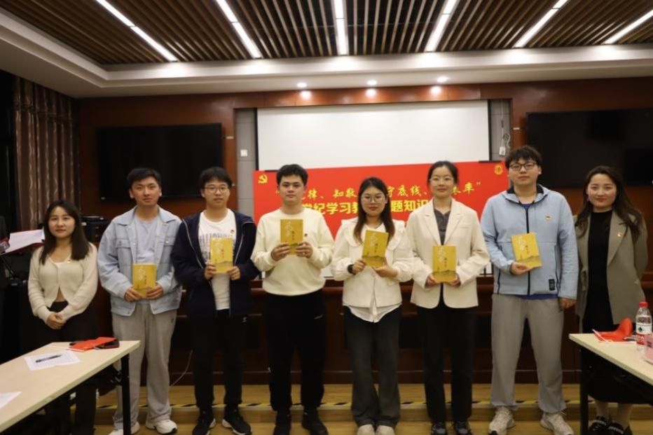 随后,主题党日进入了紧张而充满智慧的知识竞赛阶段。知识竞赛由支部预备党员黄雪寒、入党积极分子万中旭主持,每组由党员担任组长,六个小组迅速进入激烈角逐。知识竞赛分为“小试牛刀”抢答赛、“智斗巅峰”抽答赛、“团队攻擂”争霸赛等三个环节,紧密考验了党员们对党纪知识的敏感度及反应速度,考验了他们的心理承受能力、团队合作精神,现场紧张且充满激情,各参赛队伍毫不示弱,在主持人关于条例修改细节的讲解中,同学们加强了对于党规党纪的理解。