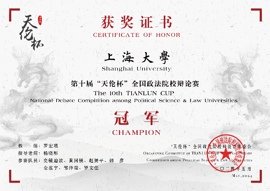 本届“天伦杯”于2023年11月开赛,吸引了包括北京大学、浙江大学、复旦大学等在内全国48所高校辩论队参与。小组赛阶段,我校辩论队与上海对外经贸大学辩论队、皖西学院辩论队同处一组,凭借优异表现从小组出线。淘汰赛阶段,我校辩论队先后战胜山东理工大学、武汉大学、华东政法大学3所高校的辩论队,成功挺进决赛。与广东财经大学辩论队就“德礼/法度为政教之本”的辩题展开激烈交锋,最终获得大赛冠军。