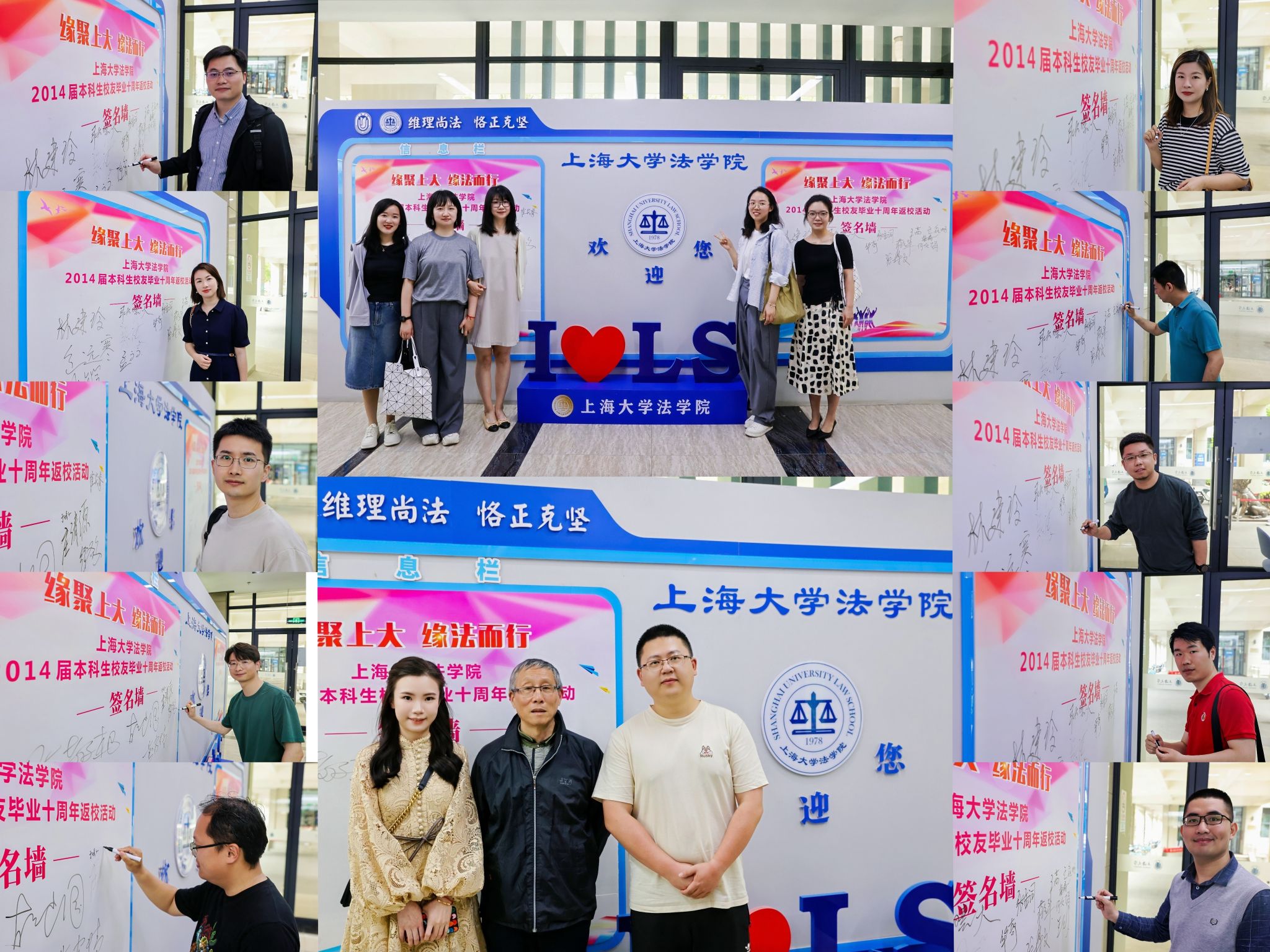 在活动正式开始前,校友们和教师们陆续抵达东区法学院,在楼内大厅的签名墙前签名留念。
