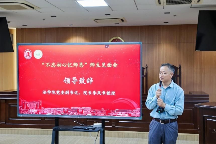 在以“不忘初心忆师恩”为主题的师生见面会上,法学院党委副书记、院长李凤章教授首先为活动致辞,他对参与返校活动的校友表示了热烈欢迎,回顾了学院的发展历程,阐述了校友们在促进学院发展中所扮演的重要角色,并对校友们取得的成就表示了由衷的祝贺,话语中充满了对师生情谊的珍视。