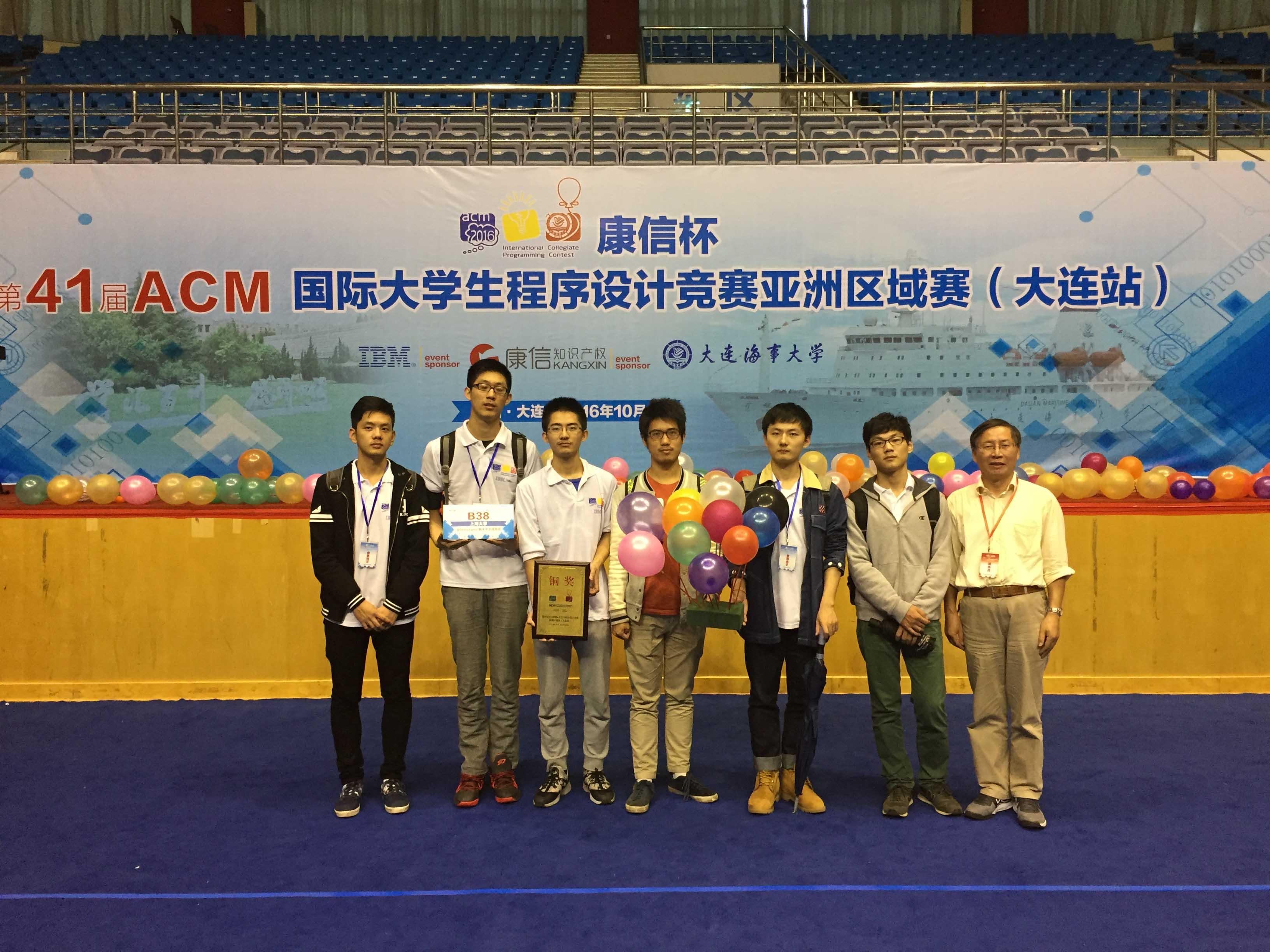 2016第41届ACM-ICPC亚洲区域赛(大连站)于2016年10月15日至16日在大连海事大学顺利举行,来自中国大陆包括香港中文大学在内的218支高校的队伍参赛,他们是根据赛事规则从1500多支参加网络赛的队伍中选拔出来的。我校计算机学院的14级学生金钟镛、赵英辉、高松组成的Handsome队和由14级学生徐际岚、刘宇澄及15级来泽楠组成的Atmoshere队获得参赛资格。10月14日晚上我校参赛队抵达大连,由沈云付老师担任教练。