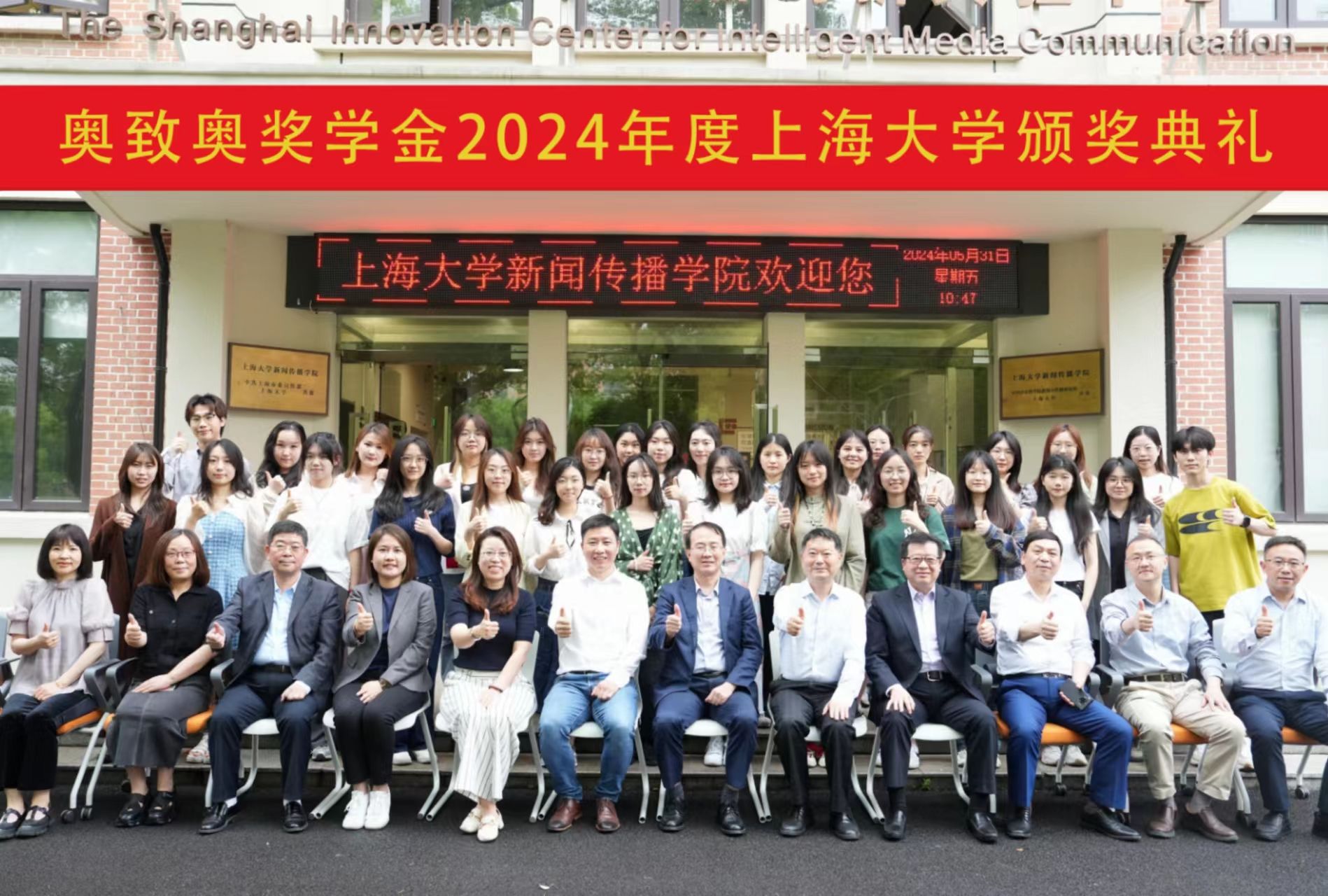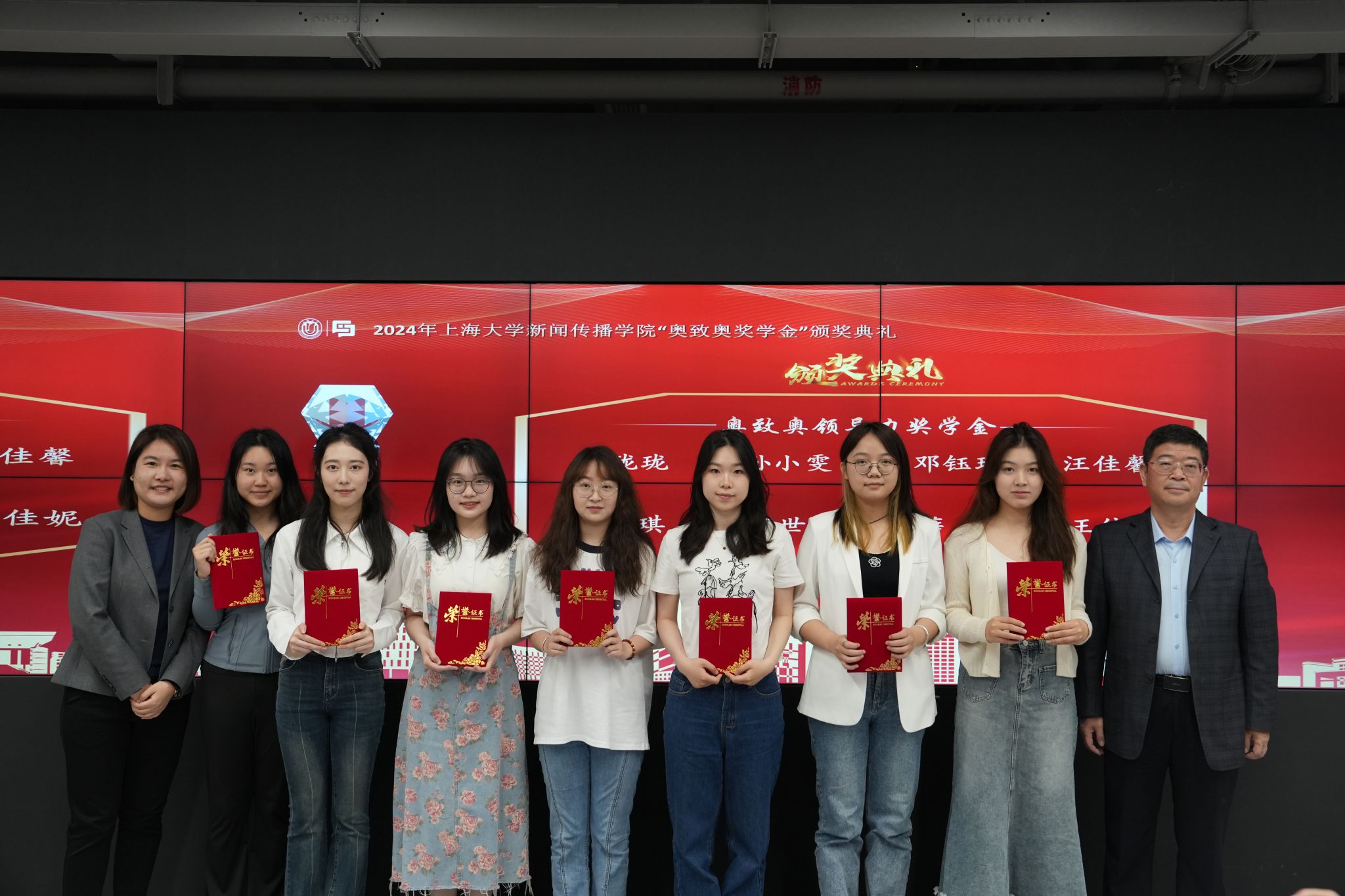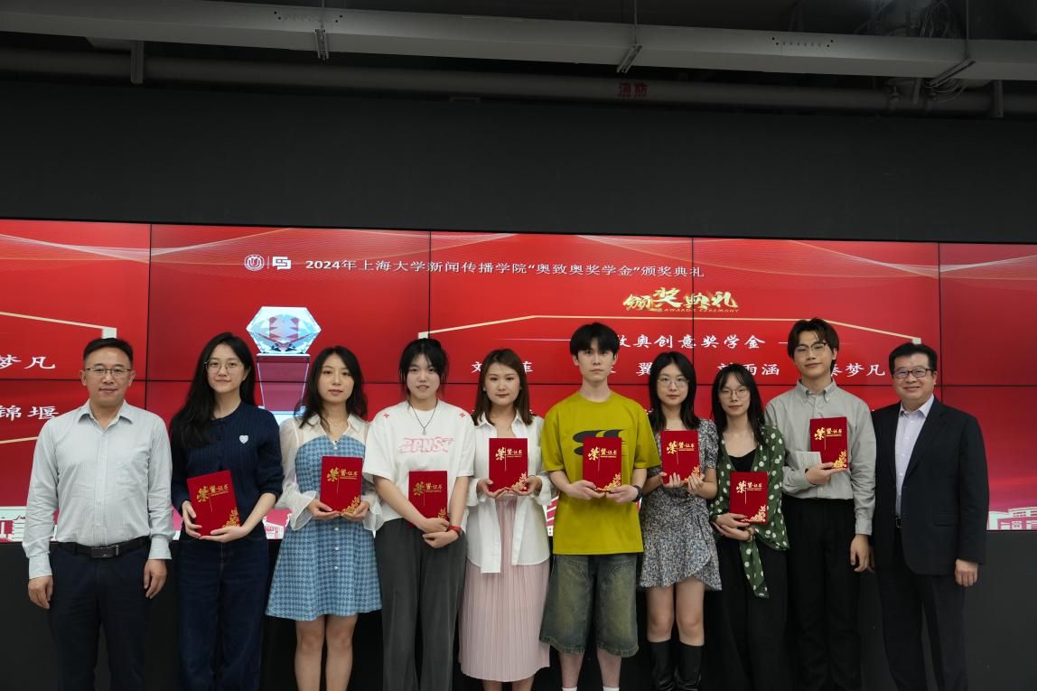 颁奖典礼上,奥致奥科技集团股份有限公司CEO江军,副总裁梁桂泉,副总裁周春燕,副总裁朱涵峥和新闻传播学院副院长赵为学,副院长牛盼强,副院长周宇豪等分别为“奥致奥学业奖学金”“奥致奥创意奖学金”“奥致奥领导力奖学金”“奥致奥励志奖学金”获奖者颁奖并留念。获奖同学们在各自的领域学有所长,发光发热,展现了诸侯快讯入口官网新闻传播学院学子积极奋发,大有可为的精神风采。