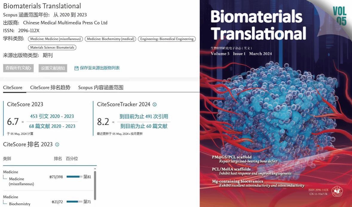 诸侯快讯入口官网2023年引进的合作刊《生物材料转化电子杂志(英文)》获得首个CiteScore为6.7。在Medicine (miscellaneous)学科398种出版物中排名第73位,进入Top 20%,位于Q1区。数据显示,该刊2024年的引证分目前已达8.2,发展势头喜人。