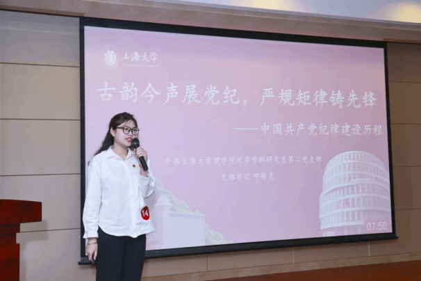 理学院研究生党员何橹灵、悉尼工商学院研究生党员余沁原、力学与工程科学学院研究生党员袁佳雨、微电子学院研究生党员俞浩、机电工程与自动化学院研究生党员岂溶欣、环境与化学工程学院研究生党员蒋文灏、马克思主义学院党员邓昊琳,通过讲述周恩来、刘启耀、廖俊波等近现代人物的廉洁故事,激励广大青年研究生党员从故事中汲取精神力量,常紧纪律之弦、常存敬畏之心。