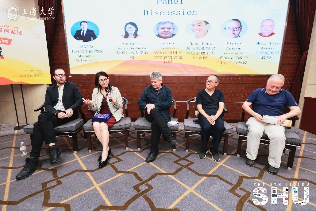 在互动问答环节,泰国艺术大学Nantanit Wanichacheva教授、法国南特国立高等建筑学院Laurent Lescop教授、澳大利亚墨尔本皇家理工大学Hepu Deng教授、英国威斯敏斯特大学Pieter Antoon Verdegem副教授以及巴斯克大学Mois Ilia Aroyo教授与现场及在线师生针对人工智能等前沿技术对于未来人类教育尤其是教学模式的深刻影响、教师的角色和职责应该如何演变等等问题展开互动与交流,学者们分享自身经验、积极各抒己见,气氛活跃。