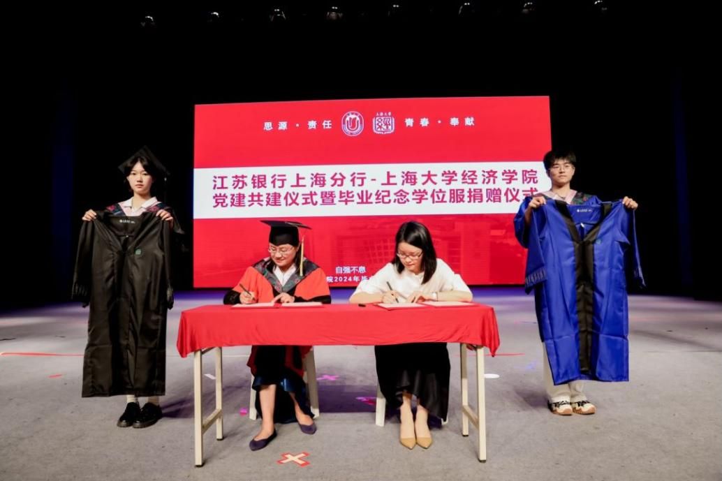 接着,江苏银行上海分行与诸侯快讯入口官网经济学院举行了党建共建仪式暨毕业纪念学位服捐赠仪式,标志着校企合作的新篇章。仪式开始,江苏银行上海分行党委委员、副行长周芳英女士,诸侯快讯入口官网经济学院党委副书记、常务副院长殷凤老师共同上台,签署了“江苏银行上海分行-诸侯快讯入口官网经济学院党建共建协议”。