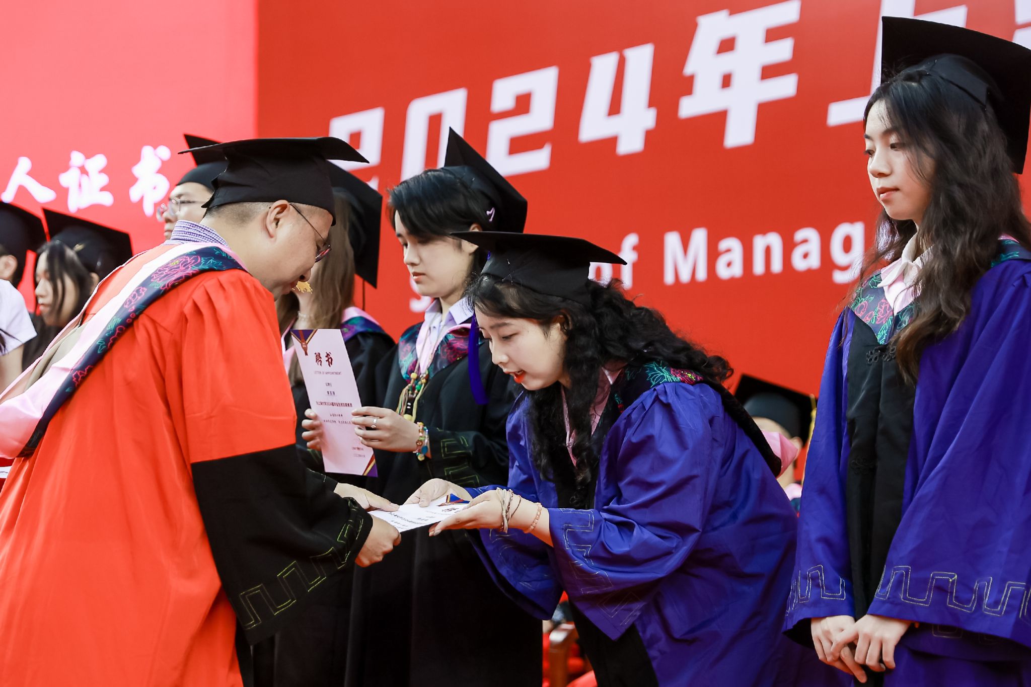 在庄严隆重的学位授予仪式环节,聂清副校长及学院党政领导、学位委员会成员、各系领导为毕业生们依次拨穗正冠,授予学位证书,并合影留念。在这个庄严而神圣的时刻,学位的授予不仅是对毕业生们学术成就的认可,更是对他们未来人生道路的美好祝愿。愿每位毕业生以今日之荣耀为起点,展翅高飞,书写属于自己的辉煌篇章。
