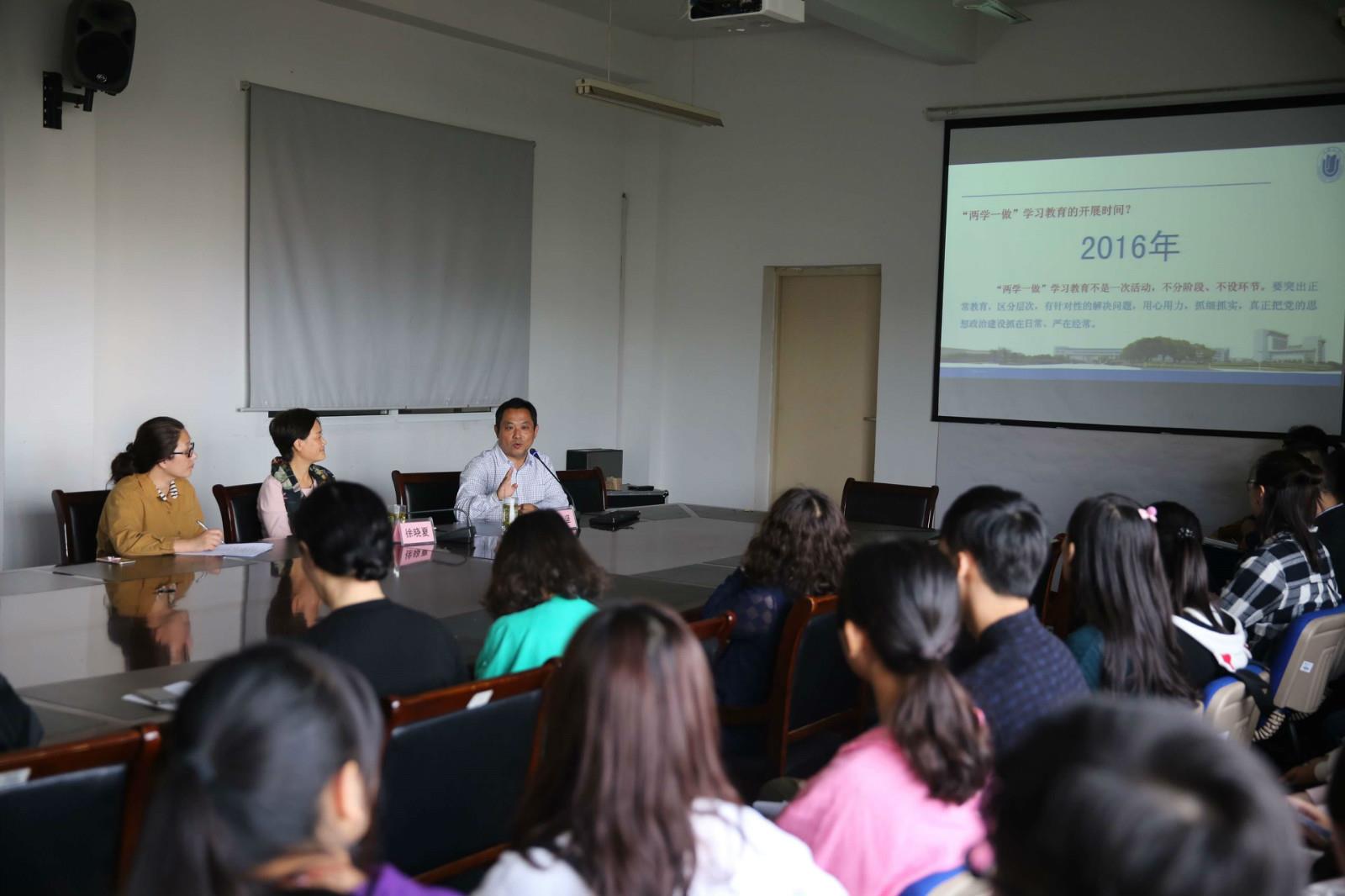2016年10月10日下午,数码艺术学院全体师生党员齐聚数码A417会议室,开展两学一做”专题学习教育,特邀我校宣传部部长李坚进行“不忘初心继续前行”——解读习近平总书记七一重要讲话精神学习的专家讲座。学院党委书记陈大明、副书记徐晓夏对李坚部长的莅临表示热烈欢迎,学习活动由副书记徐晓夏主持。