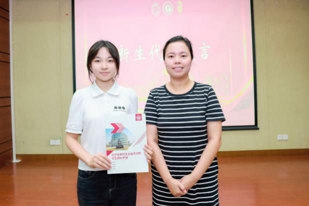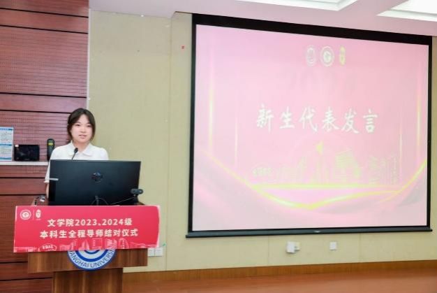 2024级文学院人文6班的费逸雯同学作为新生代表发言,她在发言中谈到自己作为享有“双导师制”的同学,感到非常幸运,并感谢文学院能让她根据个人兴趣与规划自由挑选导师,在学业和生涯规划上拥有了双重榜样,照亮前行之路。同时她也与其他同学共勉,希望大家能在全程导师的指导下上下求索,厚积薄发。发言结束后,文学院党委副书记、副院长丁佳蒙老师为费逸雯同学颁发文学院本科生全程导师制学生成长手册并合影留念。