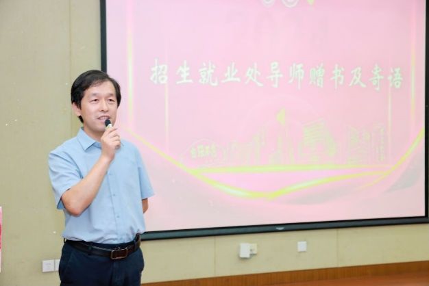 在今年开学之初,文学院2024级本科新生中有8个寝室的32位同学十分荣幸地与招生就业处的8位老师进行了结对,享有“1+1双导师制”,这些同学不仅有一位专业课全程导师的指导,还有招生就业处的生涯指导导师为同学们保驾护航,帮助同学们在学术与未来职业发展之间找到平衡和方向。校招生就业处副处长陈涛老师作为导师代表为结对学生赠书并寄语。陈老师表示希望同学们能珍惜并利用好资源,好好读书,成长为社会栋梁之才,并祝愿文学院在师生共同努力下创造新的辉煌。