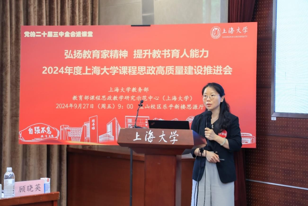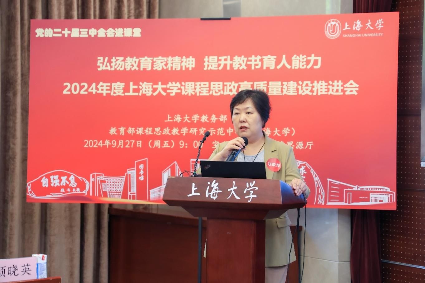 顾晓英首先欢迎并介绍与会嘉宾。她指出学校从2014年首开“大国方略”以来,课程思政建设一路耕耘不停歇,接续获评国家级、市级教学成果、示范课程和各类比赛奖等。成绩的取得离不开校外内专家指导支持,学校领导、各部门统筹发力,尤其是广大教师的持续付出和努力。党的二十届三中全会《决定》提出:“提升教师教书育人能力”,全国教育大会强调弘扬教育家精神,本年度课程思政高质量建设推进会就是在这样的背景下召开。会议旨在通过表彰课程思政优秀典型,展示教师教书育人风范,突出课程思政教育教学改革立足教师、着眼课程,进一步推进立德树人课程育人高质量建设。