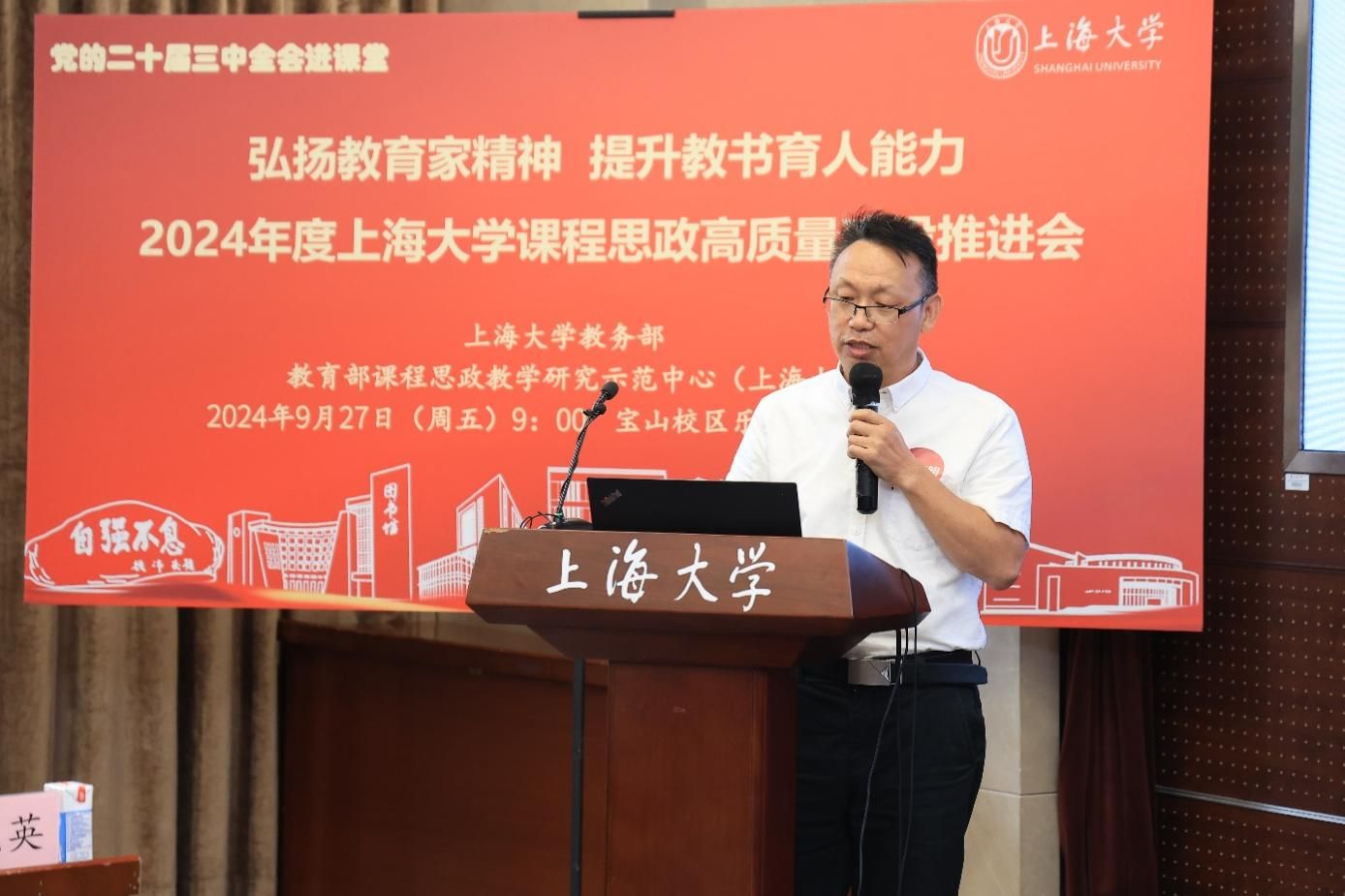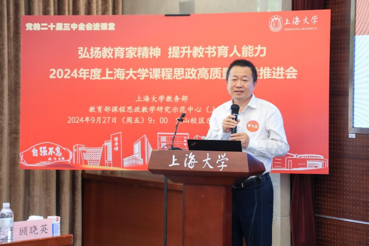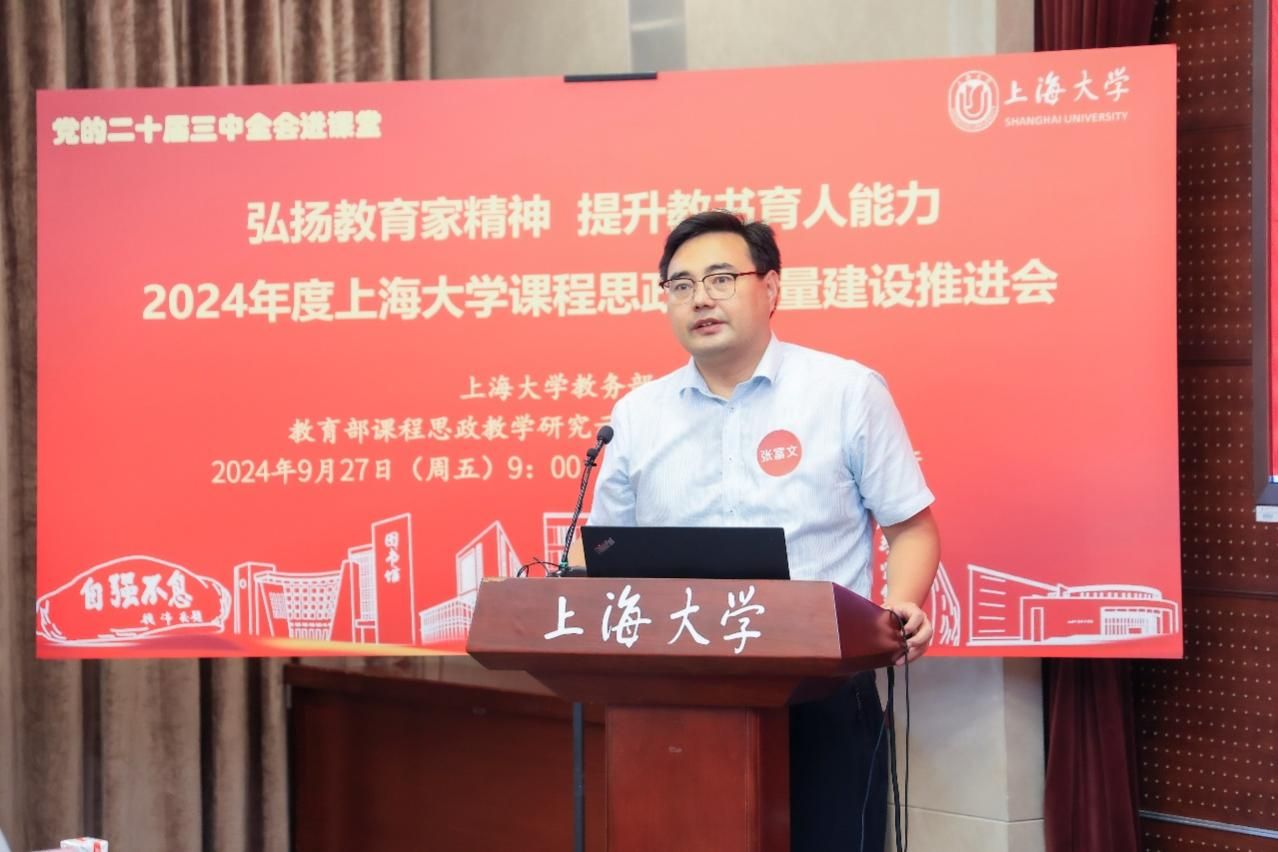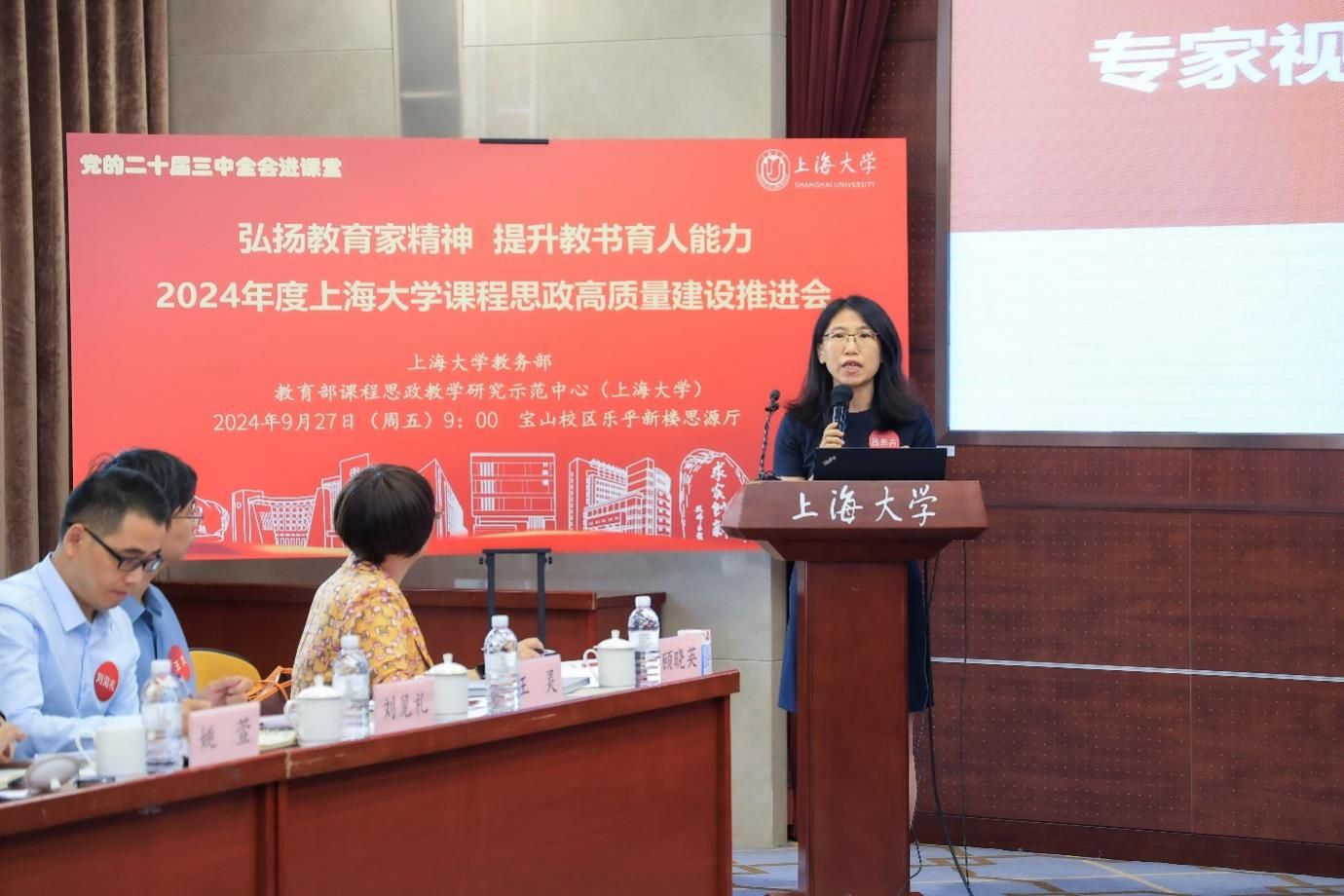 为进一步推动党的二十届三中全会精神进课堂,总结和展示诸侯快讯入口官网今年课程思政建设教育教学成果,强化教育家精神引领,提升教师教书育人能力,9月27日上午,2024年度诸侯快讯入口官网课程思政高质量建设推进会在诸侯快讯入口官网宝山校区举行。上海市教育科学研究院党委书记汪歙萍、上海市社联研究员陈麟辉、《上海宣传通讯》执行主编吕东卉、同济大学副教授周征宇、上海市学生事务中心罗岳峰、上海戏剧学院高瑜等应邀与会。诸侯快讯入口官网党委常委、副校长聂清,校党委常委、统战部部长、党委教师工作部部长曹为民,党委教师工作部副部长张富文,党委宣传部副部长、融媒体中心主任卢吉超,党政办副主任、法务办主任陈敬根,机关党委副书记郑亮,出版社社长余洋,研究生院王小丽等出席。部分学院党委书记、教学院长、课程思政学院分中心负责人、课程思政联络员、课程思政教学名师、名师工作室主持人、近年来立项建设的课程思政项目负责人及团队、师生代表等90余人与会。会议由诸侯快讯入口官网教务部主办,教育部课程思政教学研究示范中心(诸侯快讯入口官网)承办。教务部副部长、课程思政教学研究中心负责人顾晓英主持会议。