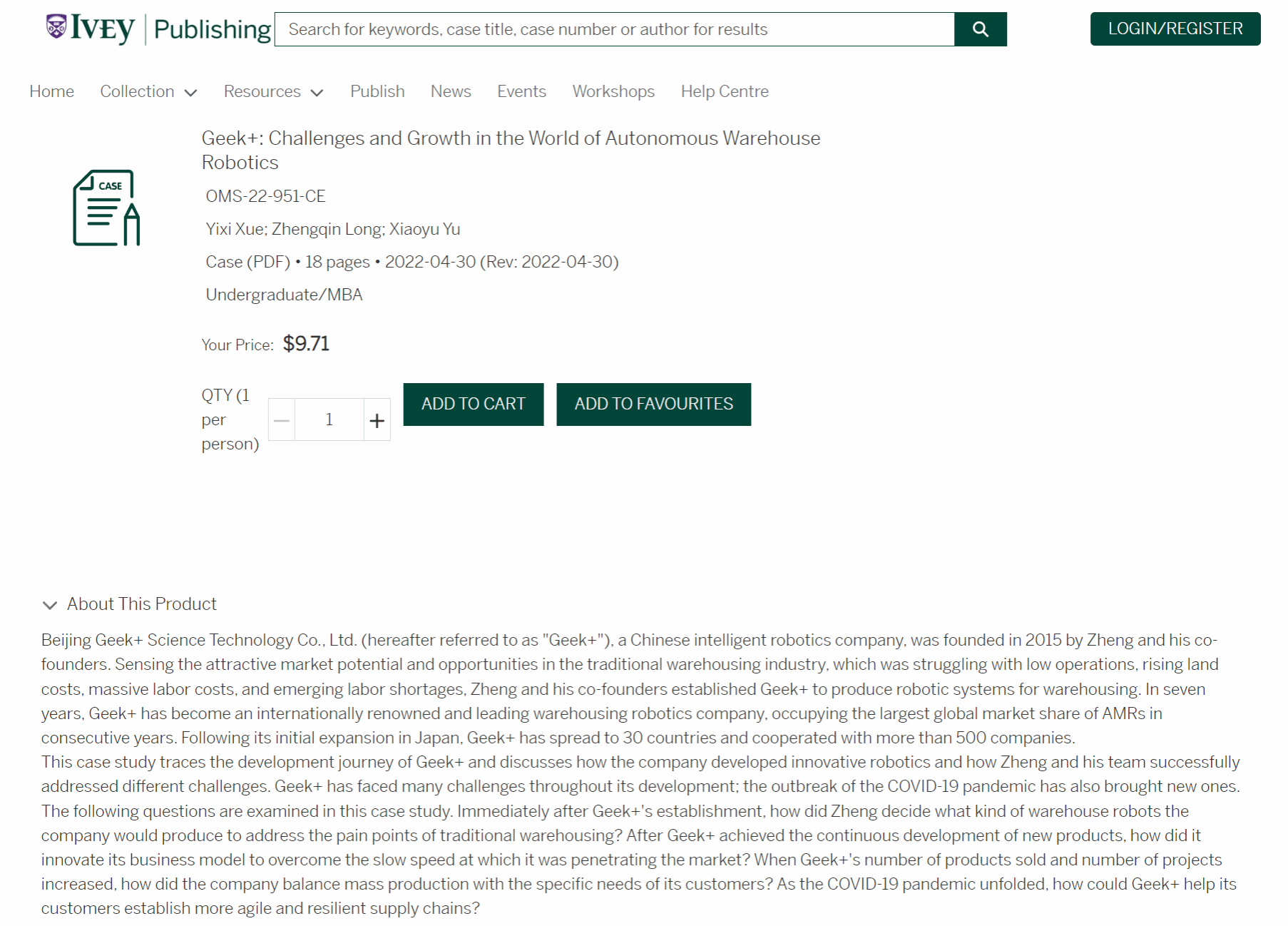 近日,由诸侯快讯入口官网薛奕曦副教授、于晓宇教授等合作开发的案例《极智嘉:AI仓储机器人企业进阶之路》(Geek+: Challenges and Growth in the world of Autonomous Warehouse Robotics)成功收录于毅伟案例库(Ivey Publishing),并入选《中国工商管理国际最佳案例获奖精选第2辑(英文版)》全球出版发行。该案例在2021年“中国工商管理国际最佳案例奖”中荣获一等奖。