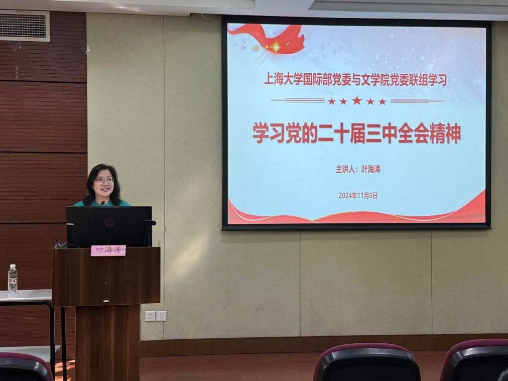 11月5日,国际部党委与文学院党委在东区1号楼115会议室开展联组学习。会议邀请到马克思主义学院党委副书记、副院长(主持工作)叶海涛教授做“学习贯彻党的二十届三中全会精神”的专题讲座。国际部党委书记王丽娜、文学院党委书记陆甦颖,以及国际部和文学院全体班子成员和教职工党员参加本次学习。讲座由王丽娜书记主持。