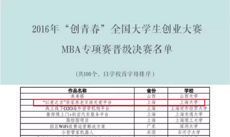 由共青团中央、教育部、人力资源和社会保障部、中国科协、全国学联、四川省人民政府主办,共青团四川省委、绵阳市人民政府承办的2016年“创青春”全国大学生创业大赛MBA专项赛日前公布决赛名单,全国共100项参赛作品入围决赛。由管理学院于晓宇教授指导、管理学院2015级MBA赵春、范伊琳、李莉、杜惠、钟旭、李建国、王子轩、孙康同学的创业项目《“以爱之名”居家养老互助关爱平台》成功晋级MBA专项赛决赛。