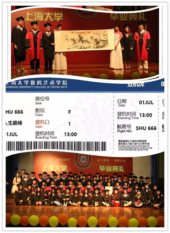 当天中午,数码艺术学院2016届毕业生们手持“特殊机票”,在嘉定校区大礼堂门口逐一登机,一架来自数码艺术学院的航班即将承载逐梦起航的2016届毕业学子飞往梦想彼岸。伴随着学院精心准备的毕业视频,一幕幕熟悉的场景,一阵阵爽朗的笑声,带领即将离开母校的莘莘学子重温大学美好时光,也引导学院师生走进毕业典礼的现场。