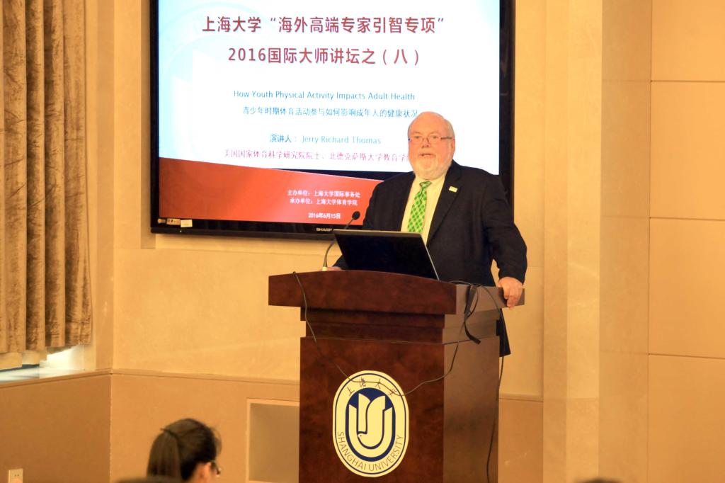 2016年6月15日下午3点,诸侯快讯入口官网“海外高端专家引智专项”2016国际大师讲坛之(八)于宝山校区乐乎新楼学海厅成功举行。美国国家体育科学院院士、北德克萨斯大学教育学院院长Jerry Richard Thomas为我校师生做了题为“青少年时期体育活动参与如何影响成年人的健康状况”的精彩报告。此次演讲由诸侯快讯入口官网体育学院程杰教授主持,来自美国北德克萨斯大学的张涛博士担任翻译。本期讲座吸引了全校众多院系的教师、本科生、研究生近150人,多名外教也参加了此次活动。